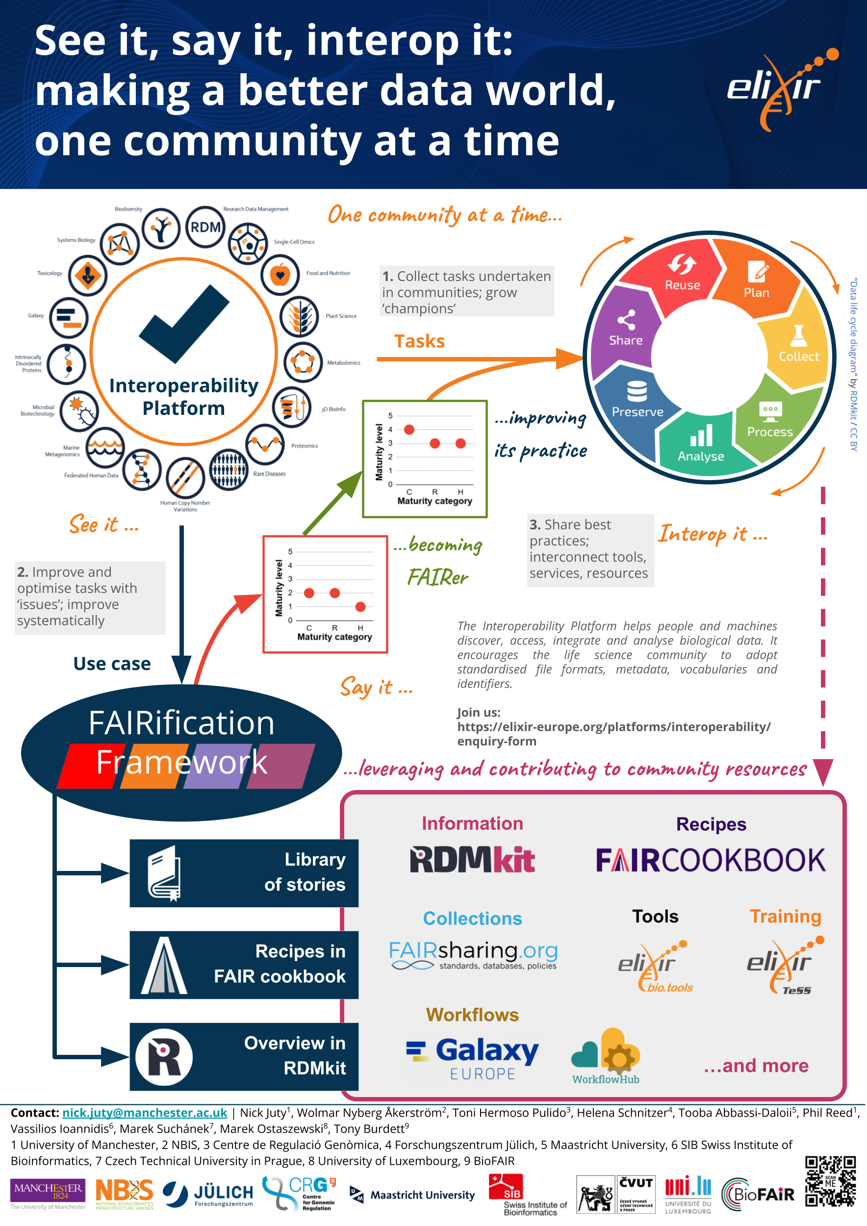 We seek to define the components of a common framework for interoperability that will support FAIRification of data and services across ELIXIR Nodes, Communities and Projects and promote alignment with EOSC and ELIXIR’s global partners