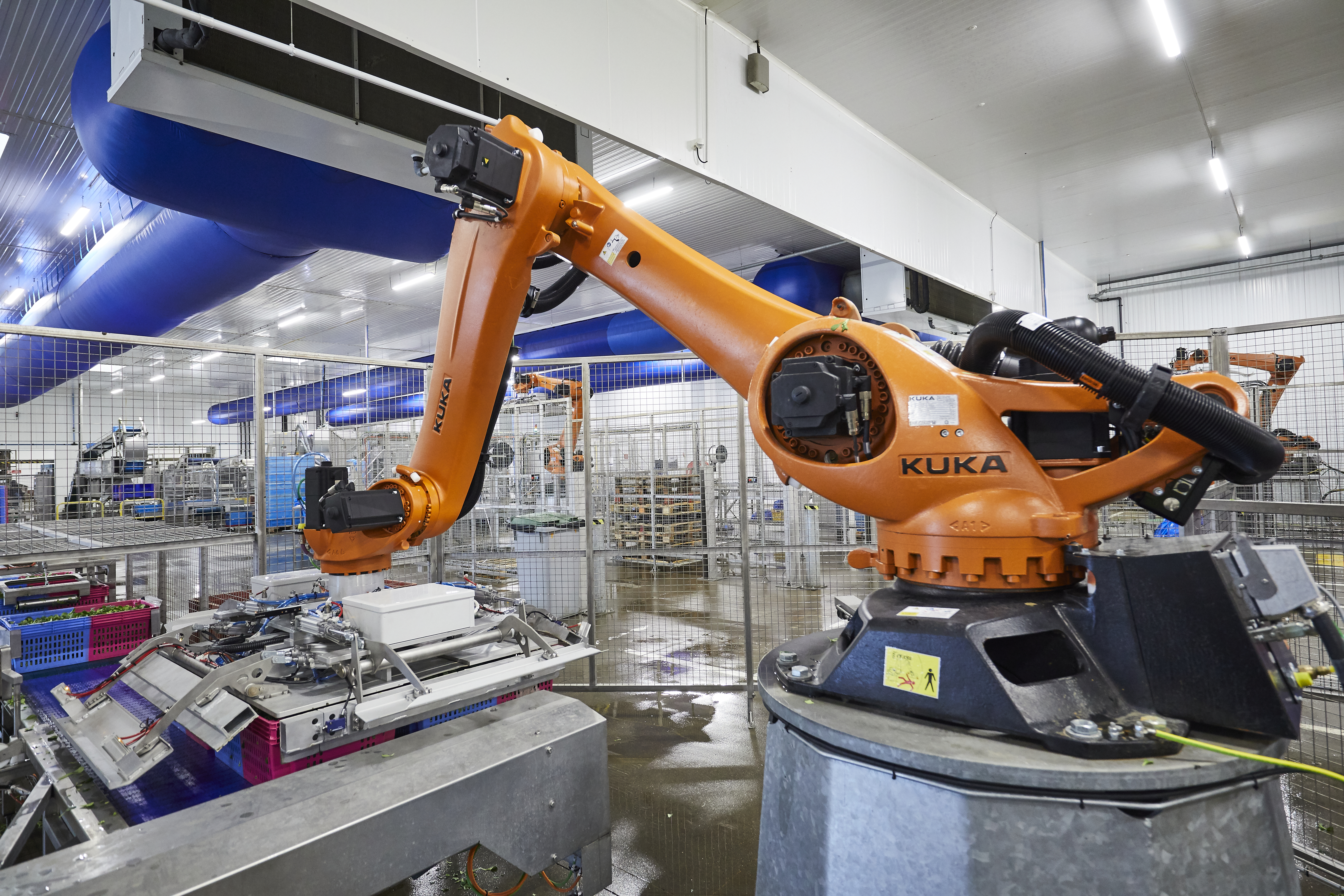 Nous concevons également des solutions robotisées permettant d’automatiser l’alimentation des process de lavage : robot vide-palox, robot de palettisation, pesage, robot de conditionnement…