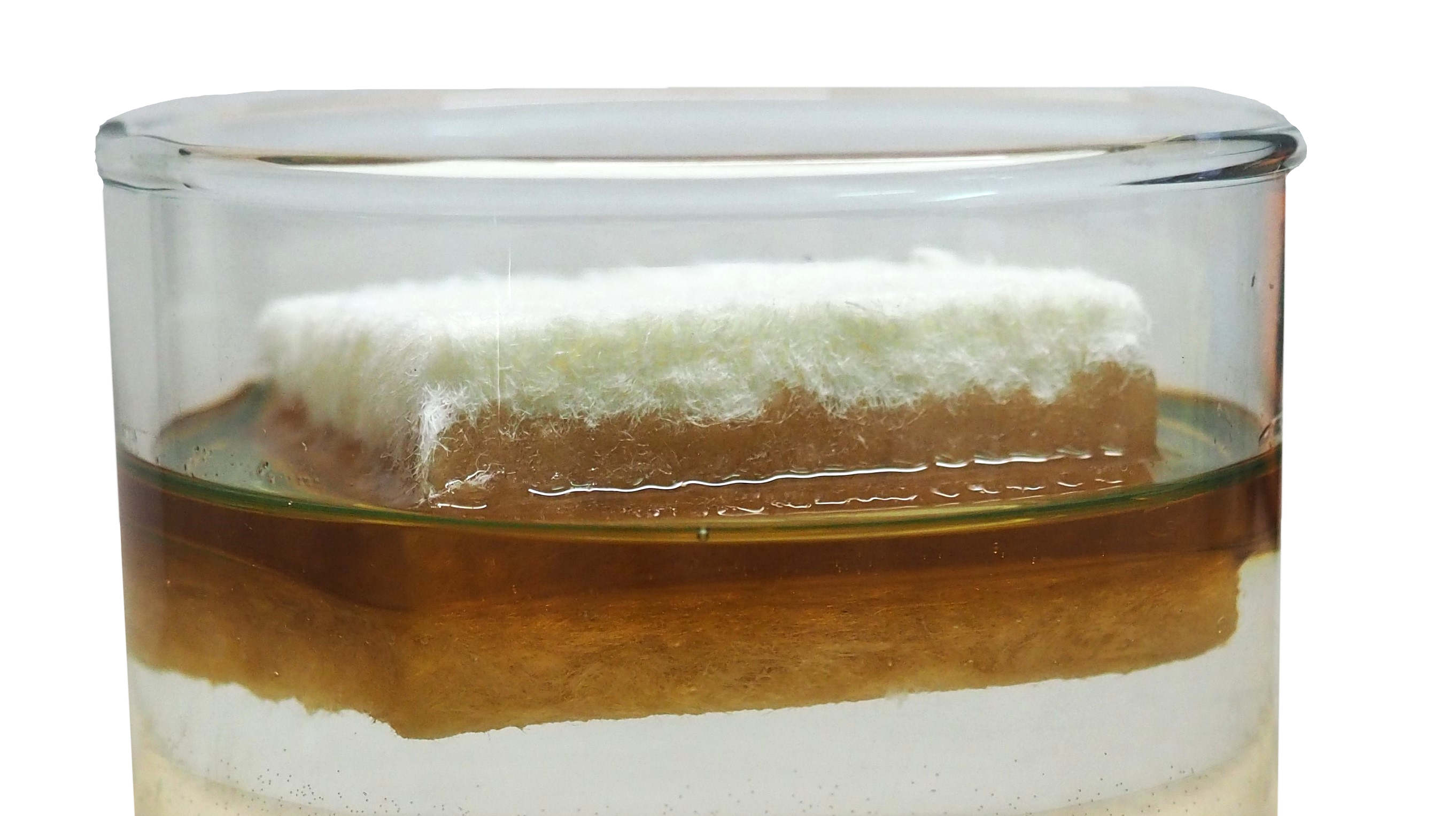 First hydrophobic porous biomaterial which does not absorb water, which is counterintuitive for 100% sustainable materials from bio-fibers. Efficiently absorbs petrochemicals on water surface while not absorbing water. Can float on water for weeks while keeping the structure and not sinking. Can be used to clean water pollution in industrial processes and sewage treatment plants. Can be used for industrial cleanup of open space while not being affected by rain.