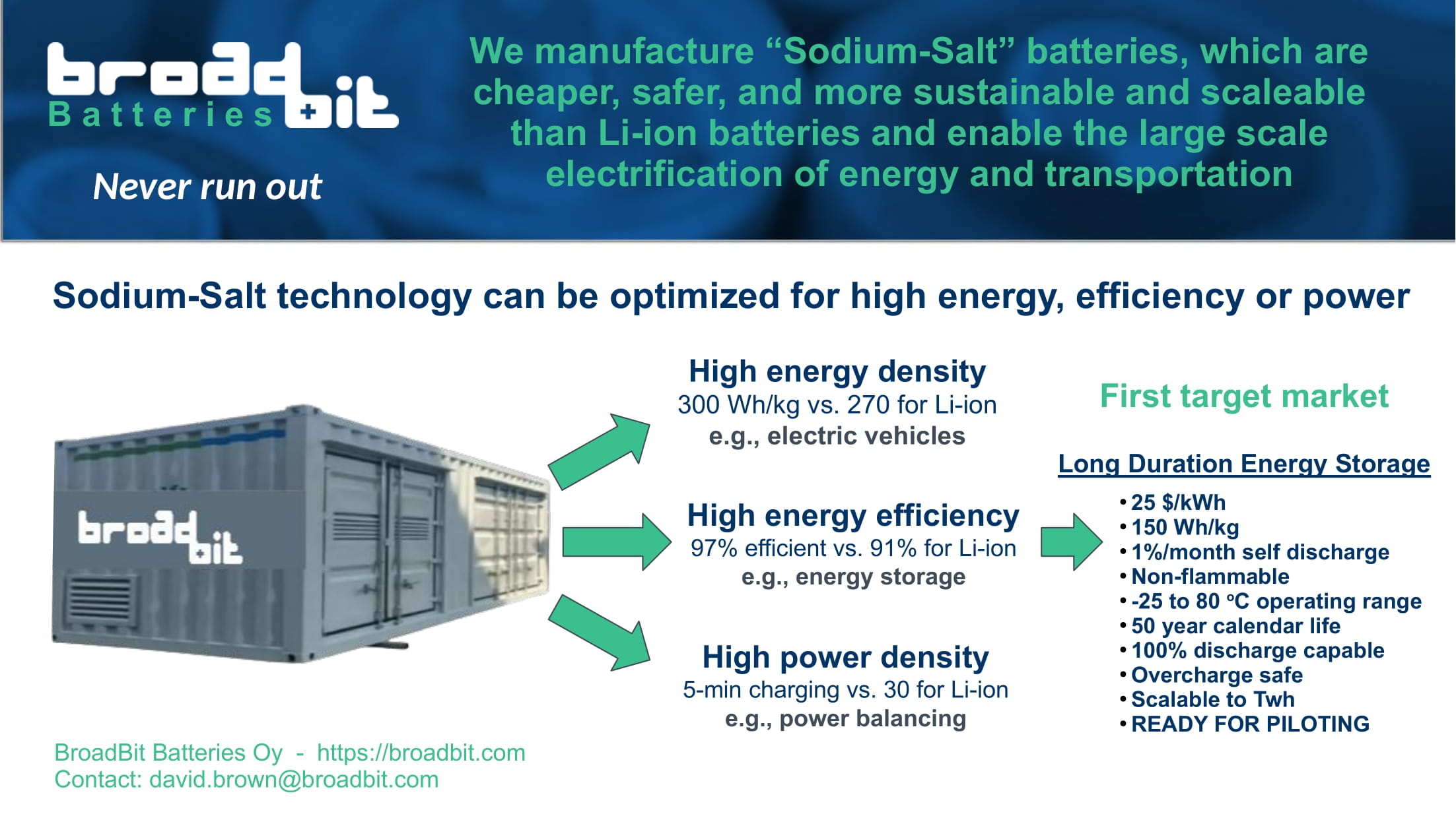 BroadBit Batteries Oy is a cutting-edge company specializing in innovative and sustainable "Sodium-Salt" battery technologies. Our team is dedicated to pushing the boundaries of energy storage, providing high-performance solutions for various industries with a focus on environmental responsibility and efficiency. We aim to revolutionize the way energy is stored and utilized. Our first target market is Long Duration Energy Storage, where we provide lower cost, higher efficiency, safer and more scaleable and sustainable batteries and enable the widespread adoption of intermittent wind and solar power.