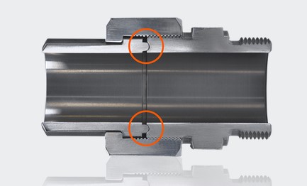 Tightness is achieved without any intermediate seal compound by direct contact of the tongue and groove seal faces. Two ring-shaped sealing areas with high stability are produced by the different radii of curvature of the tongue and groove. The braking surface on the DILO tongue part prevents the seal area from being deformed. The result: high and long-term tightness.