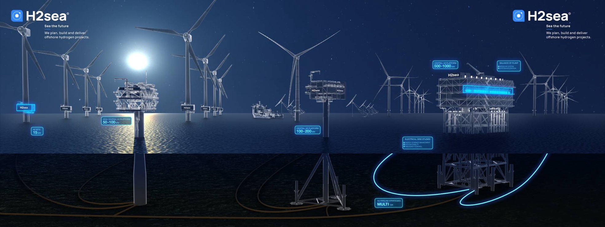 H2sea pioneers offshore green hydrogen with a fully integrated design approach. Our expertise covers hydrogen production m modules, platform design (50-1000MW), hydrogen transport through repurposed pipelines, centralised, decentralised and hybrid production models, storage solutions, cost reduction, grid stability and off-grid production. Our aim is to advance scalable, economic, and reliable offshore green hydrogen.