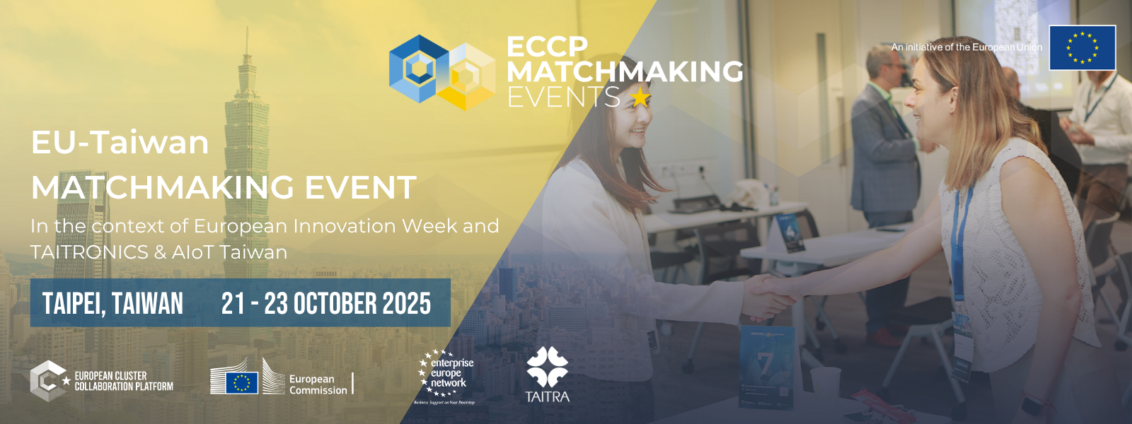 The European Commission (EC), through the European Cluster Collaboration Platform (ECCP), will host the EU–Taiwan Matchmaking Event in Taipei, Taiwan on 21 October - 23 October 2025. This event will be organised in collaboration with the European Economic and Trade Office in Taiwan, Taiwan External Trade Development Council (TAITRA) and Enterprise Europe Network (EEN). It will take place in the context of the TAITRONICS and AIoT Taiwan and European Innovation Week.