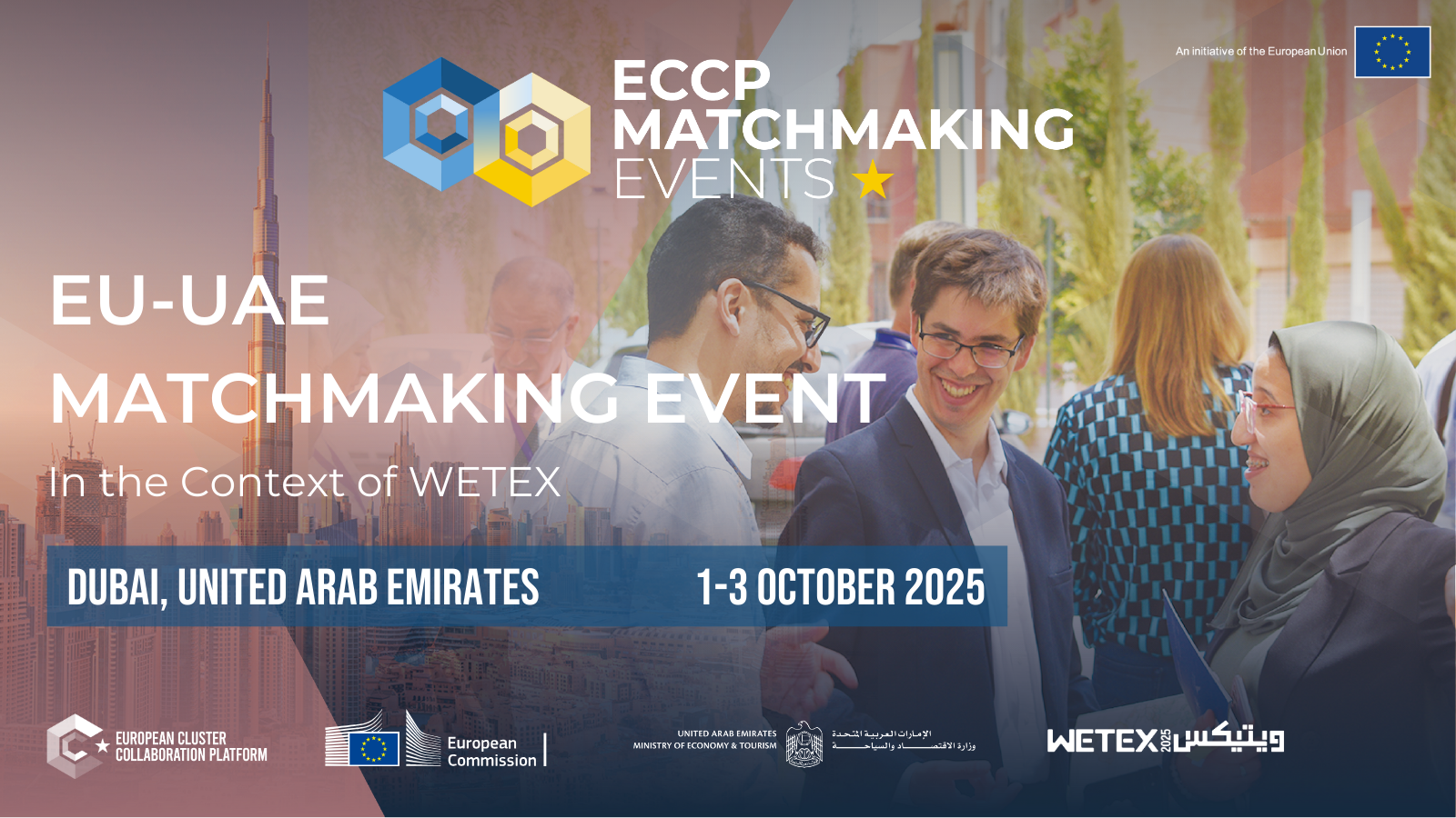 The European Commission (EC), through the European Cluster Collaboration Platform (ECCP), will host the EU–UAE Matchmaking Event in Dubai, United Arab Emirates (UAE) on 1 – 3 October 2025. This event will be organised in collaboration with the Ministry of Economy and Tourism of UAE . It will take place in the context of the WETEX exhibition.