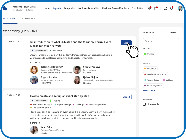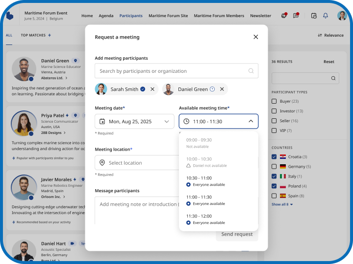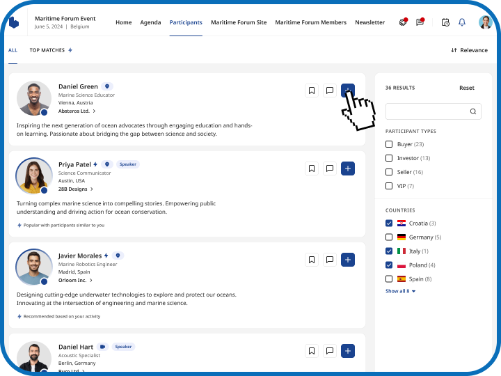 Go to the participants list to find out who you could meet at the event and who is offering interesting and promising business opportunities. Use the filters on the right or browse through your AI Profile recommendations in the My Matches section to narrow down your selection and find the most suitable collaboration partners that match your goals and interests. This allows you to maximize your chances of making valuable connections and achieving successful outcomes at the event.