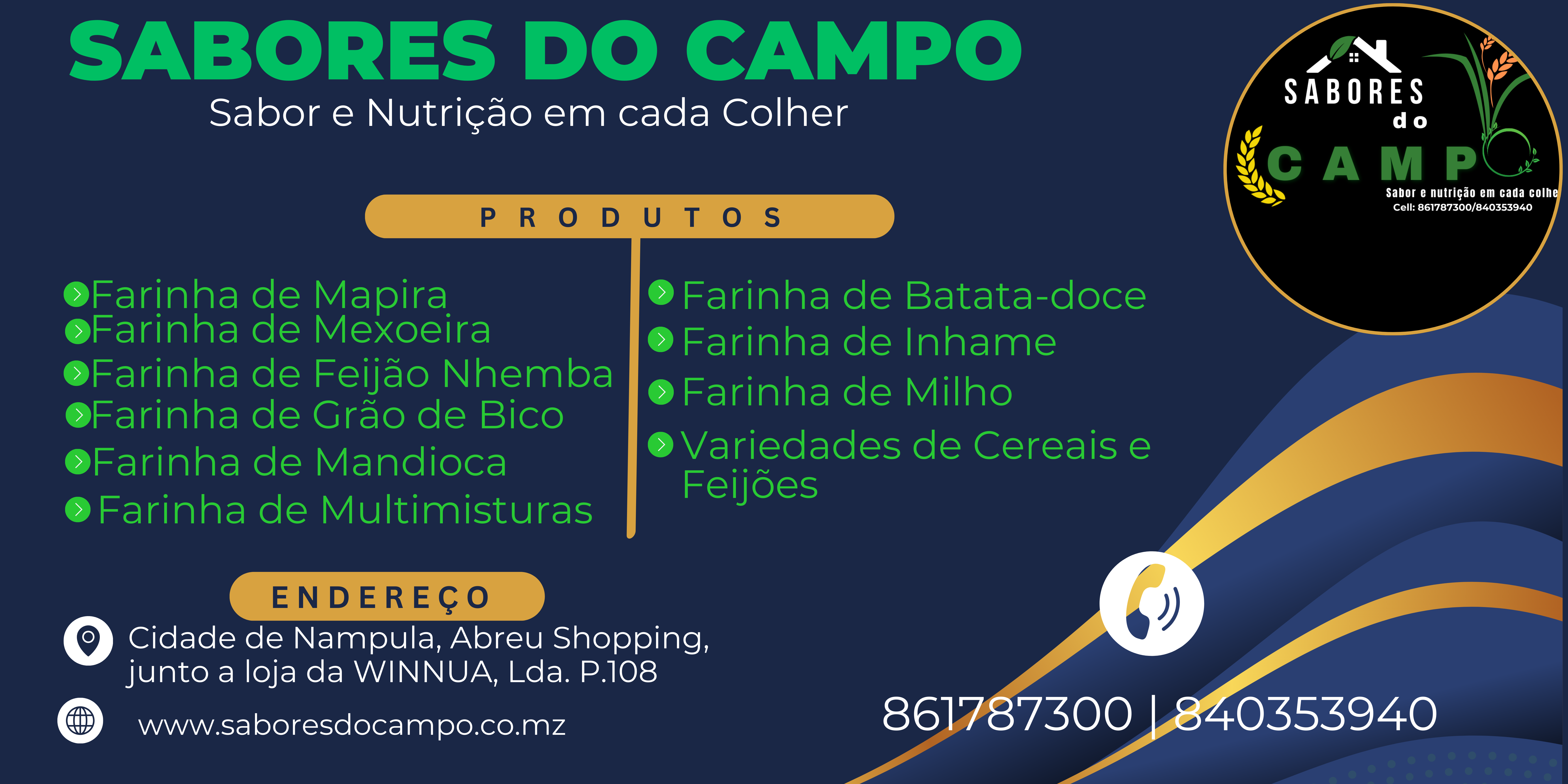 Sabores do Campo é uma empresa moçambicana de agroprocessamento em rápido crescimento, sediada em Lichinga, província do Niassa. Especializa-se na produção e distribuição de farinhas fortificadas 100% naturais, feitas a partir de culturas locais como mapira, mexoeira (sorgo), milho, feijão-nhemba, grão-de-bico, mandioca, arroz, inhame (madumbe), batata-doce e multimisturas. Os produtos são livres de aditivos químicos e voltados para a melhoria da nutrição, segurança alimentar e valorização da agricultura local.