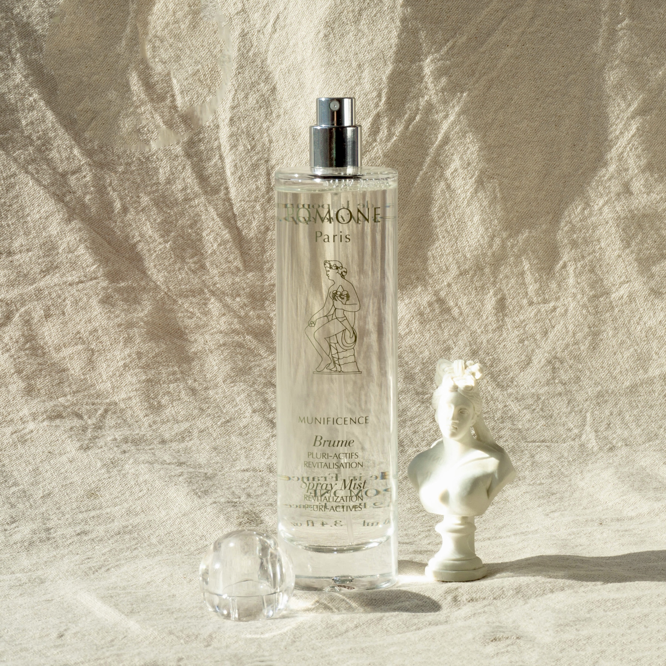 Skincare product presented in a glass bottle, with screen-printed decor, fine mist pump, cardboard box from sustainably managed forests.