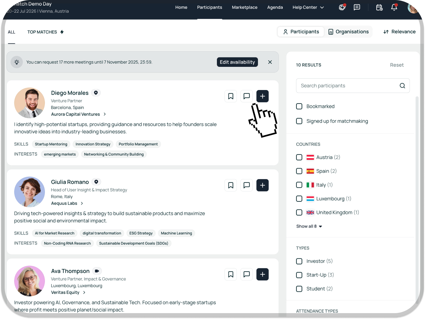 The platform’s matchmaking tool helps you find the most promising contacts. Browse the participant list, use filters, or check your AI Profile recommendations to discover partners that match your goals. Engaging with suggested profiles can lead to valuable connections and unexpected opportunities.