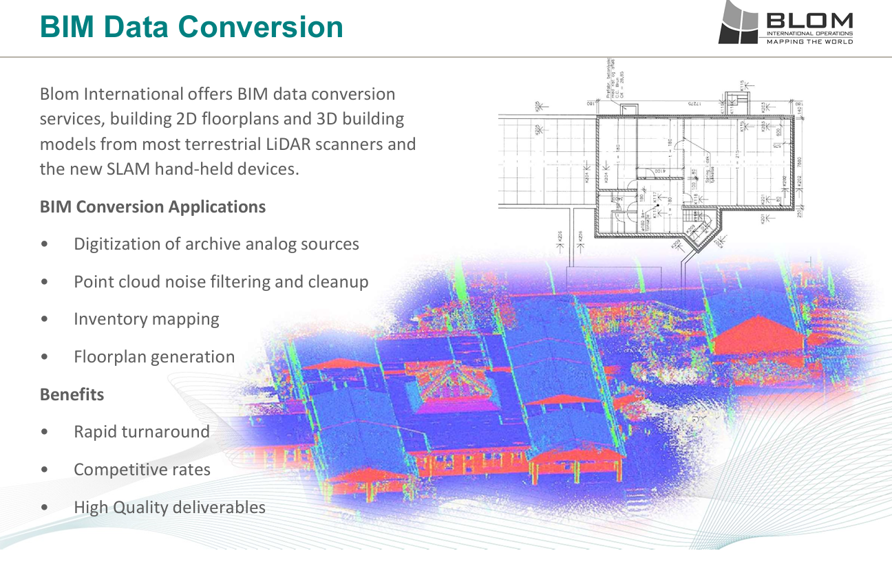 As a relatively new technology and addition to the services portfolio of Blom International, Building Information Modeling (BIM) already plays an important part in our daily operations. We are specialized in the conversion of indoor SLAM point cloud datasets into floor plans and multi-floor 3D interior building models. Our international clients trust our speed and accuracy in creating precise and complete datasets in the Autodesk and MicroStation environments.