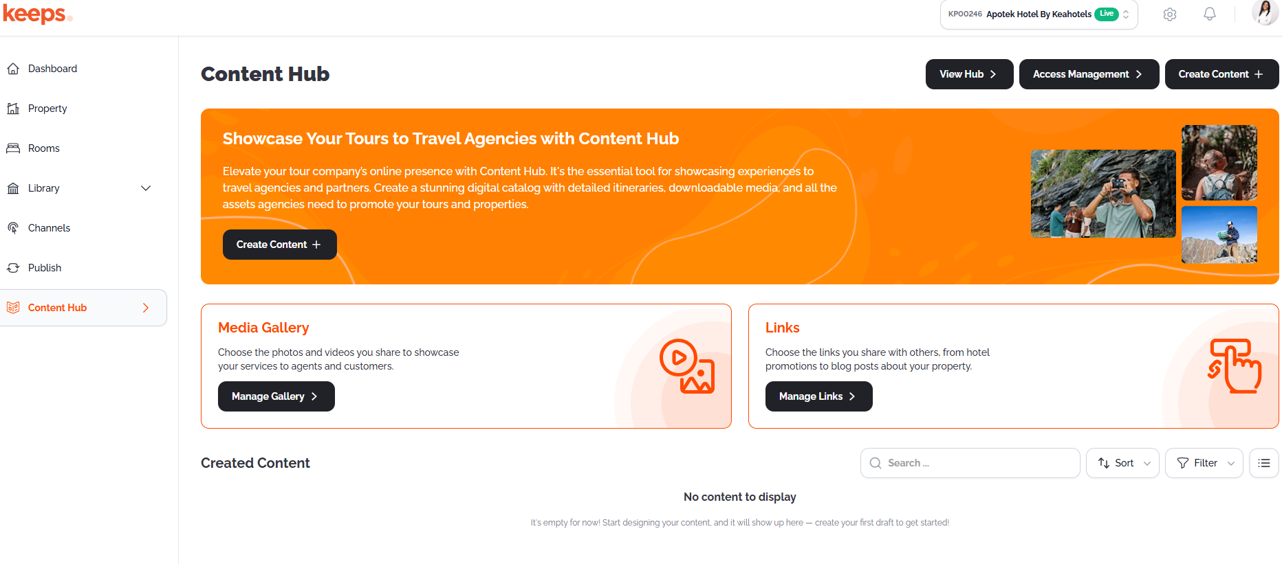 Með Content Hub þarftu ekki lengur að deila skjölum úr google, dropbox, í tölvupósti eða með wetransfer. Þú einfaldlega hleður upp efninu sem þú vilt að sé í birtingu fyrir ferðaskrifstofur og þær hafa aðgang að því, myndum, kynningum, myndböndum osfv. Allt efni á einu svæði. Ferðaskrifstofur munu líka geta leitað eftir ákveðnu efni, t.d. bara norðurljósamyndum eða mat á veitingastaðnum og fengið þær upp og hlaðið niður. Þú þarft því ekki að eyða tíma í að búa til myndamöppur og deila, því content hub er self-service fyrir ferðaskrifstofur til að sækja efni.