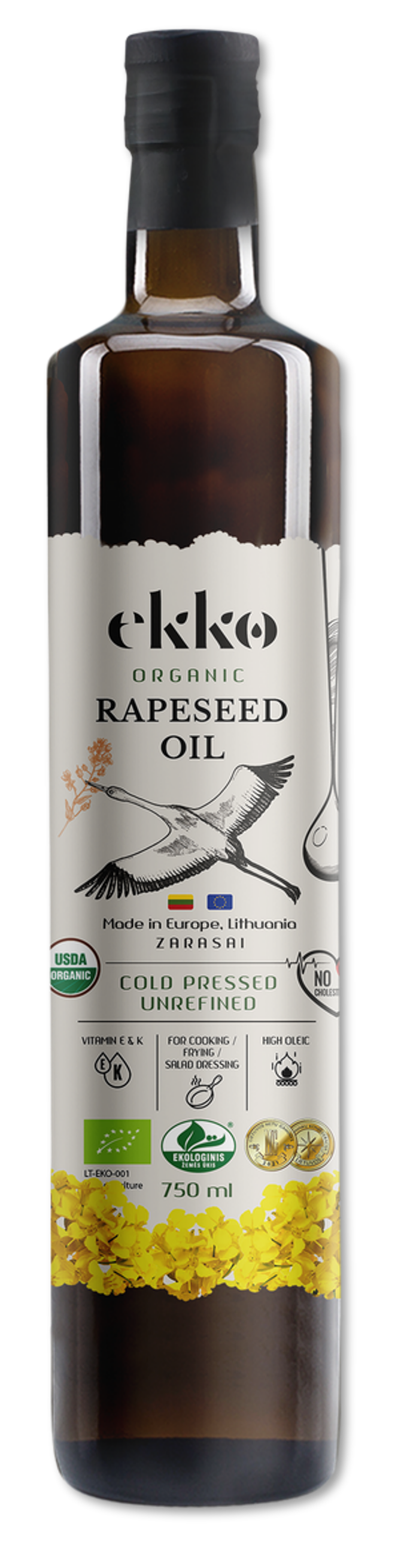EKKO organic cold pressed unrefined rapeseed oil is officially certified – 100% organic, completely clean & natural product. Made only from finest quality ecologically grown rapeseeds complying with the strictest quality standards & using the most advanced cold-pressing technique.