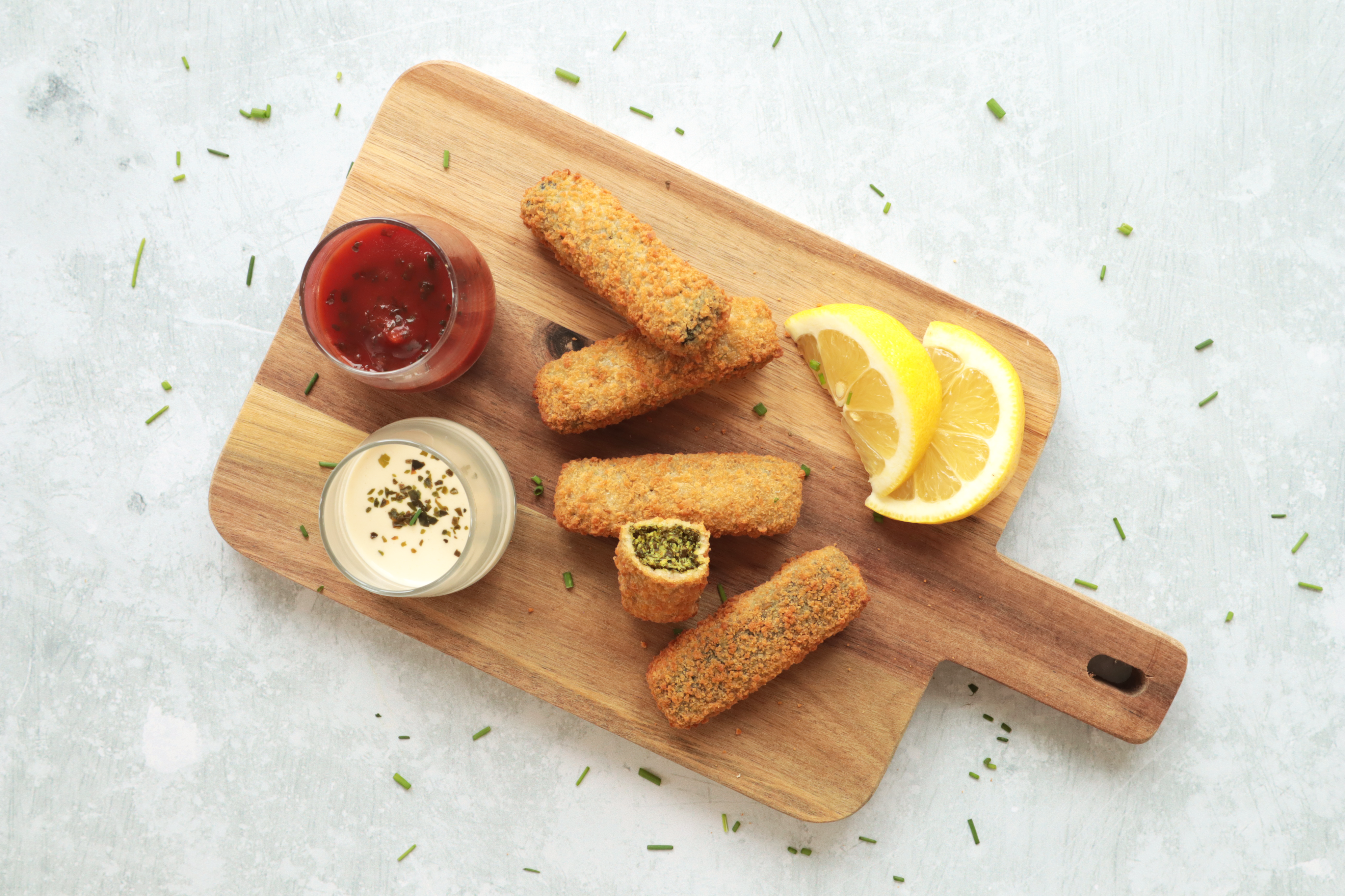 Beneath their fine, crispy breading, our sticks reveal a light heart with a delicately iodized plant flavor.