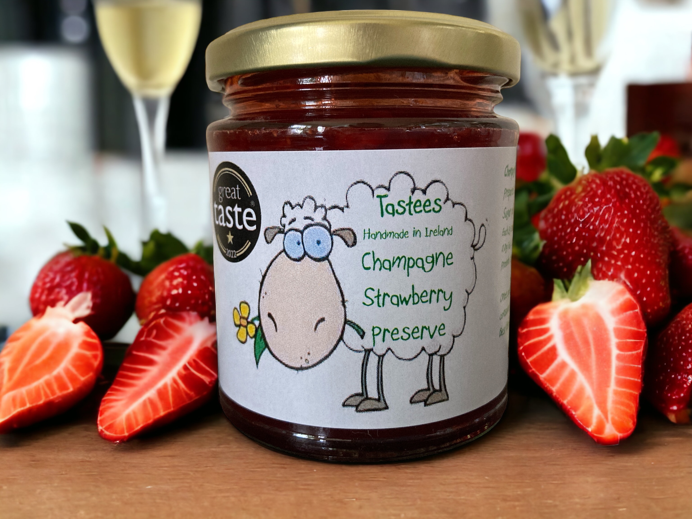 Local strawberries cooked with jam sugar and pectin powder along with a drop of Champagne to create a delicious preserve that goes great with a fresh homemade scone.