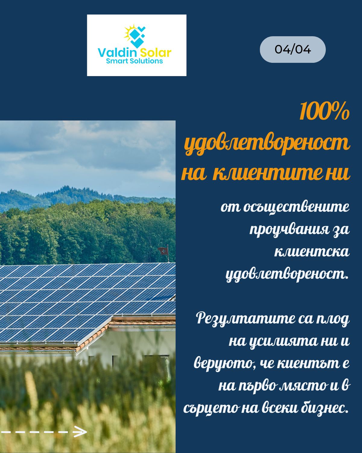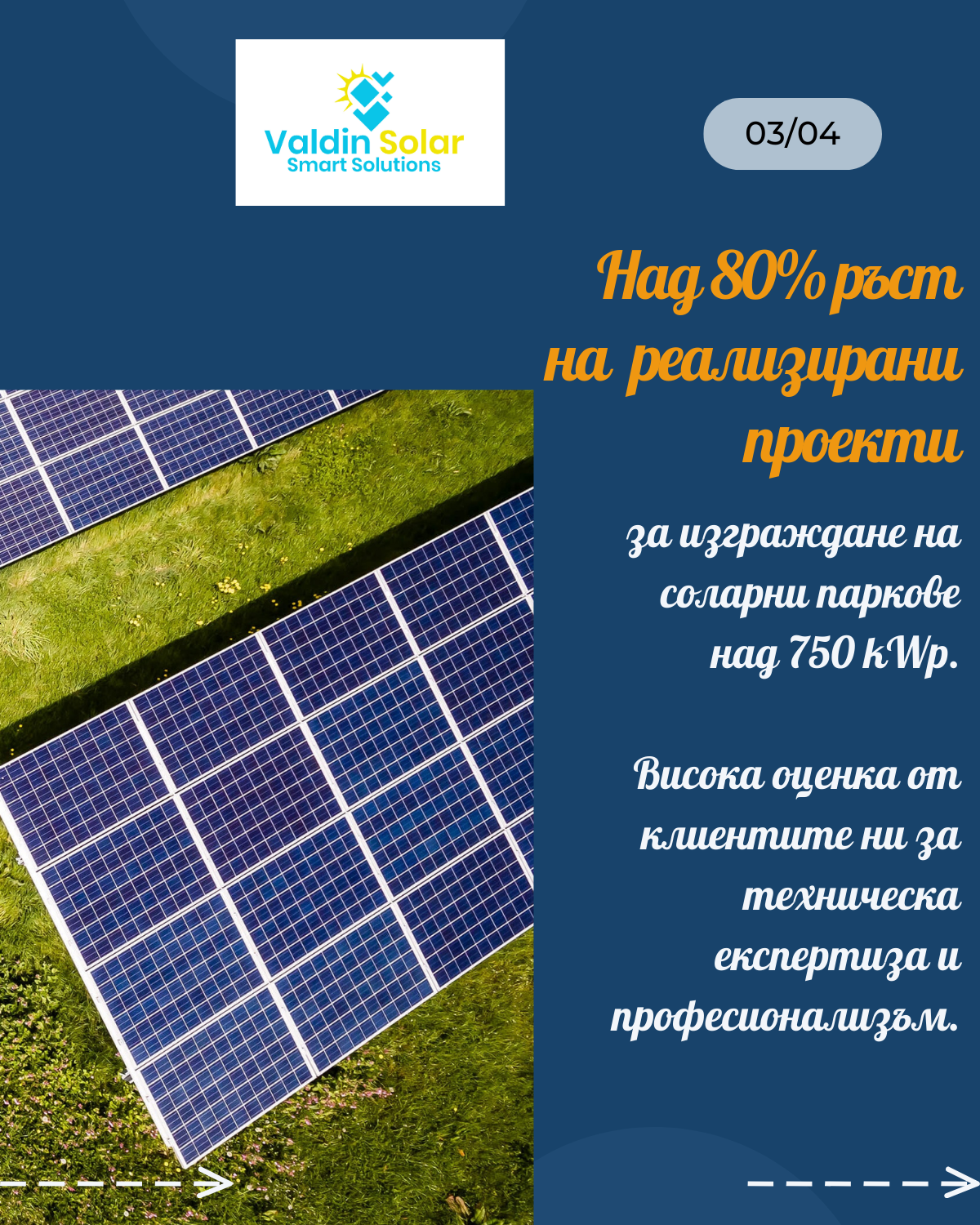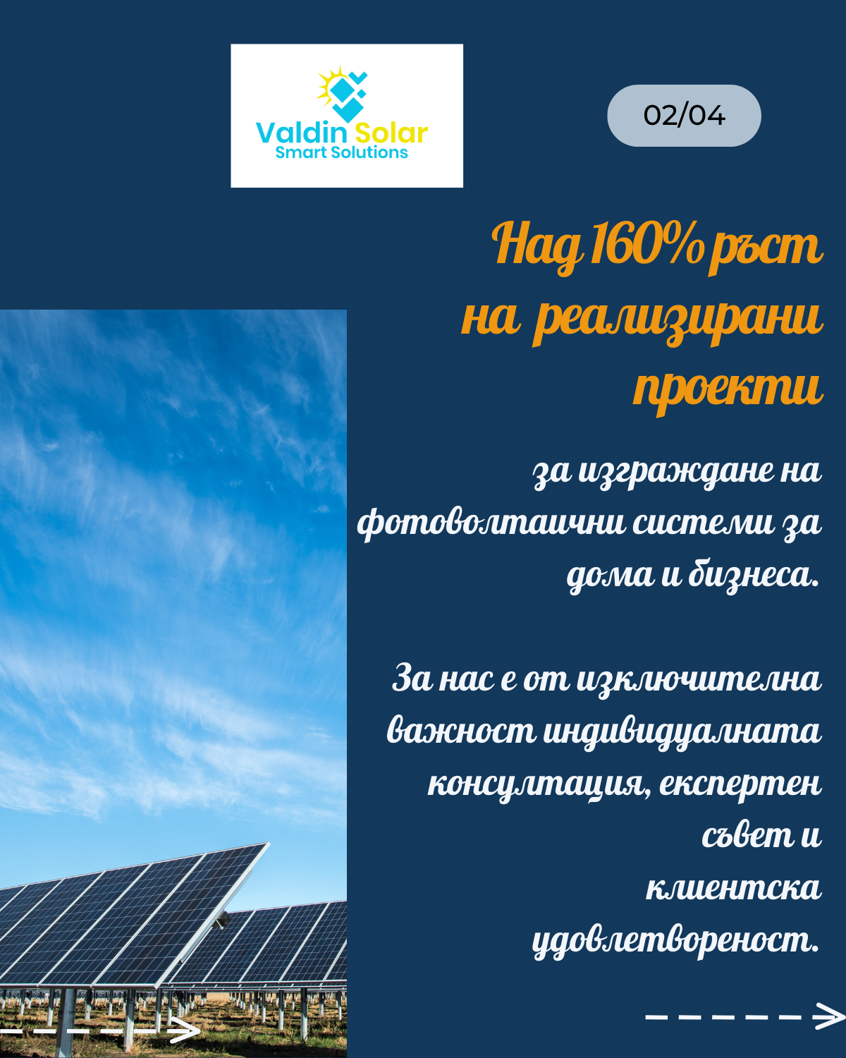 VALDIN SOLAR is an innovative company specializing in the field of renewable energy resources. For over 15 years, we have been offering innovative solutions to our clients related to installation, assembly, subscription service and maintenance of photovoltaic systems and solar parks.