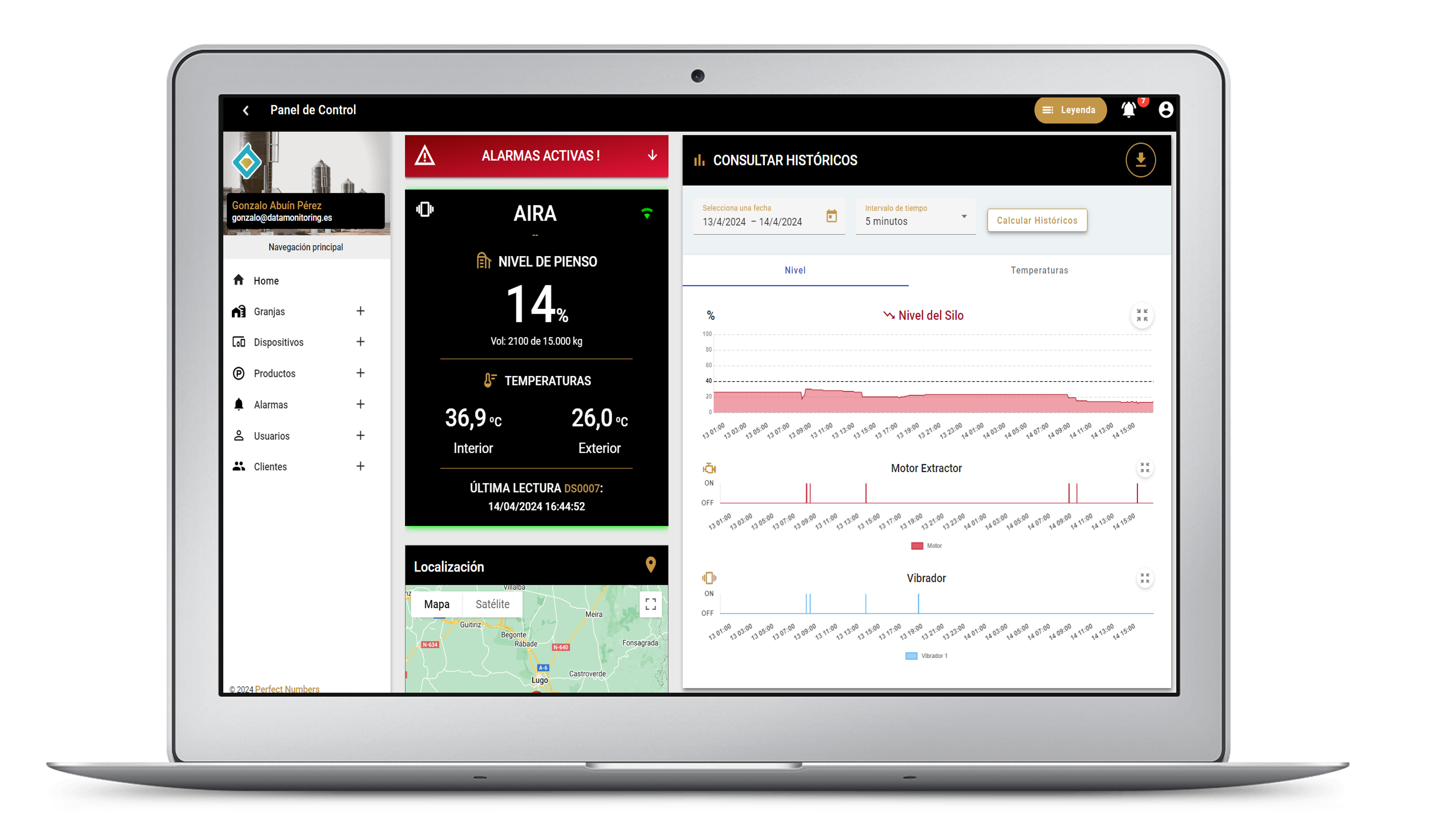 Solución de monitorización que nos permite saber cuántos kilos de pienso tenemos en cada silo. Nos permite conocer la temperatura en el interior del silo en tiempo real.