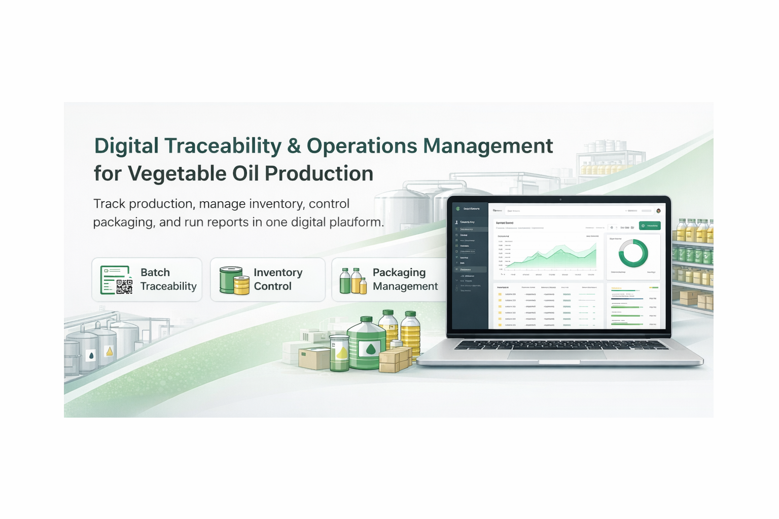 Digital Traceability and Operations Management for Vegetable Oil Production is a software solution designed to support the digital transformation of vegetable oil producers and processing facilities. The system helps companies manage production processes in a more transparent, efficient, and controlled way by bringing critical operational steps into a single digital structure.
