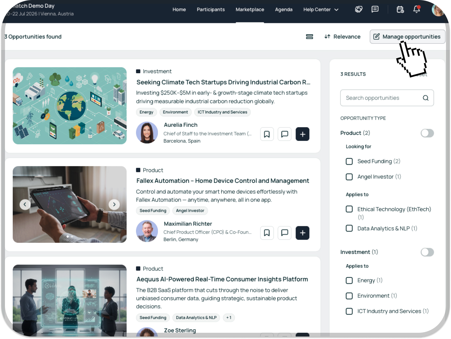 To elevate your profile and attract more meeting requests, present your opportunities in the Marketplace—whether products, services, projects, or areas of expertise. Entries can be added seamlessly through your Dashboard or directly from the list of opportunities, though availability may vary across user groups or event formats. Proactively highlighting your offerings positions you to connect with the right partners and transform initial interactions into valuable, long-term collaborations.