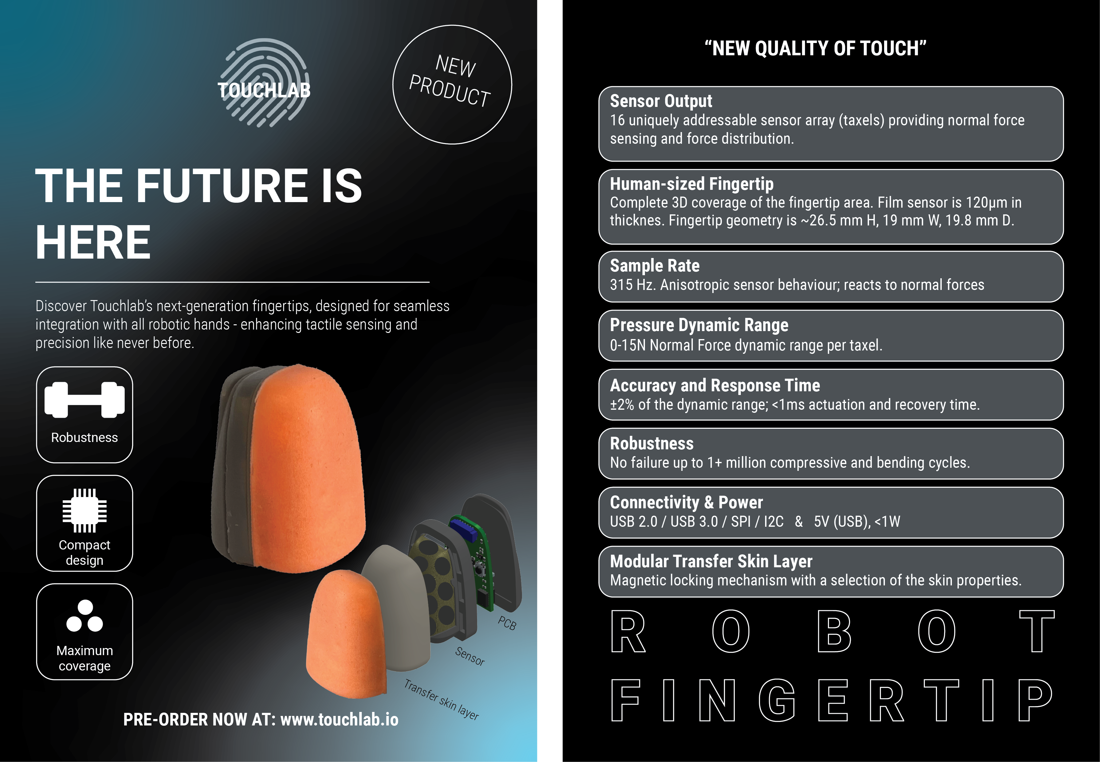 TouchLab Ltd, founded in 2018, is a deep-tech company pioneering tactile sensing for robotics and advanced manufacturing. Its patented multilayer electronic skin mimics human touch, integrating proprietary electronics and AI to interpret pressure, detect slip, and enable predictive control. This breakthrough enhances robotic interaction with delicate objects beyond vision and force sensors.