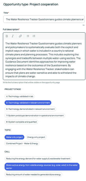 Publish your Project idea and define what kind of collaboration you are offering or looking for. Projects are only visible to registered Platform members