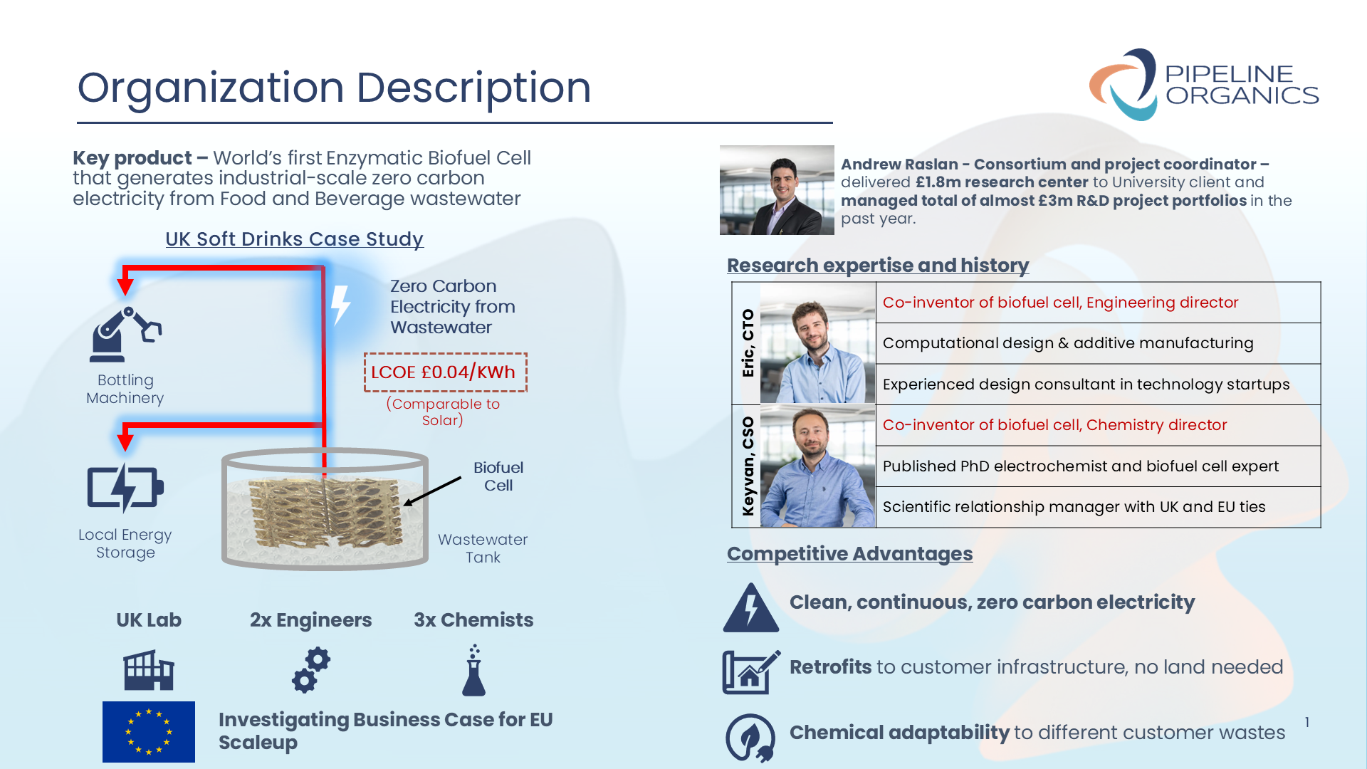 With this in mind, Pipeline Organics are developing the world's first biofuel cell that can generate industrial-scale electricity from food and beverage waste. We achieve this through published PhD expertise in biofuel cells, electrochemistry, bio-coatings, computational design and additive manufacturing. Our vision is to plug the clean energy gap left behind by wind, solar, anaerobic digesters and other mature technologies, in a world where industrial electricity consumption is growing by 3% annually and approximately 61% of global electricity production still comes from polluting sources. Dirty energy is one of the biggest threats that can destroy the climate – we are here to provide the energy solutions that industries need when existing technologies are not enough.