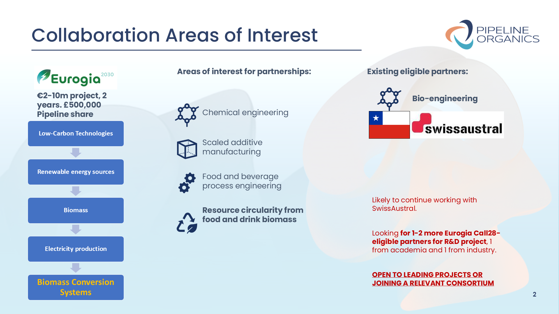 Materials circularity and the circular economy, where the value of our electricity-from-waste processes can be enhanced by a co-offering with a materials-from-waste/biomass company;