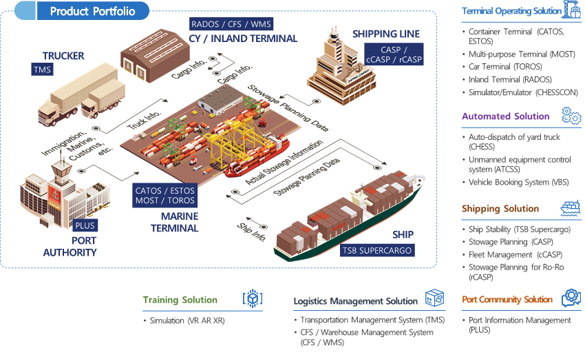 Total Soft Bank, Ltd. (hereinafter TSB) is a shipping port logistics IT solution company listed on KOSDAQ with more than 30 years of experience in developing and building solutions. We have an integrated product line that encompasses the prehistoric, terminal, and port sectors, and we also have patents for the operation and technology development of logistics research institutes. We have the highest level of IT professionals in Korea and provide high-quality customized services to our customers.