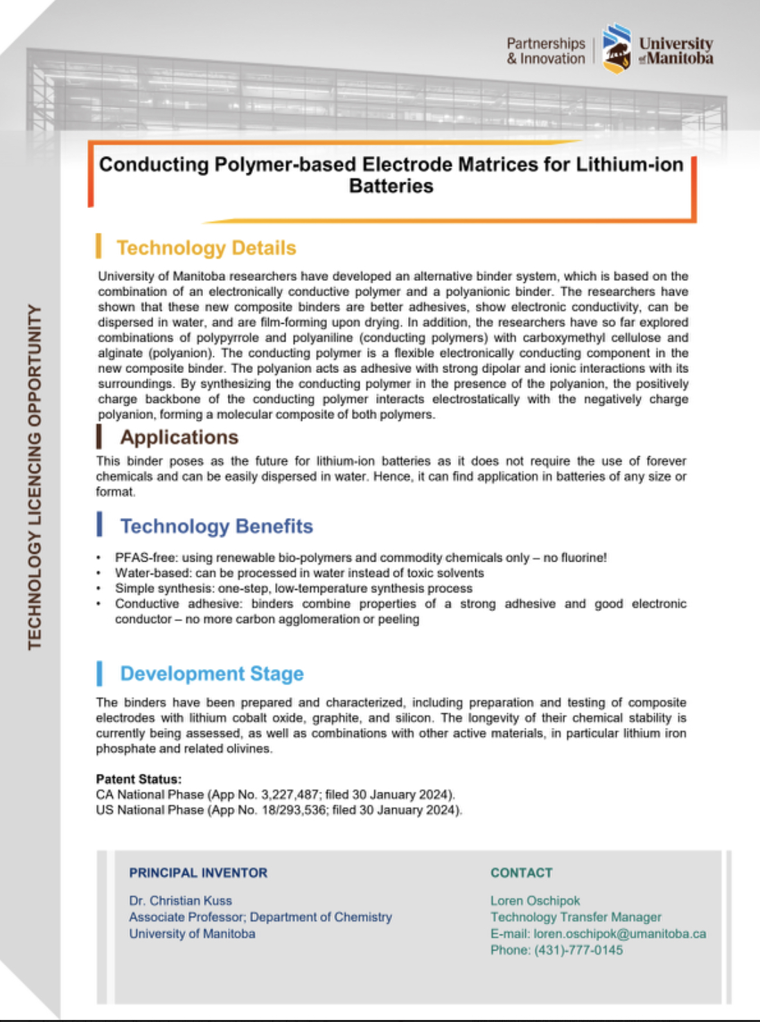 Looking for partners in the commercialization of aqueous battery binder technology developed at University of Manitoba