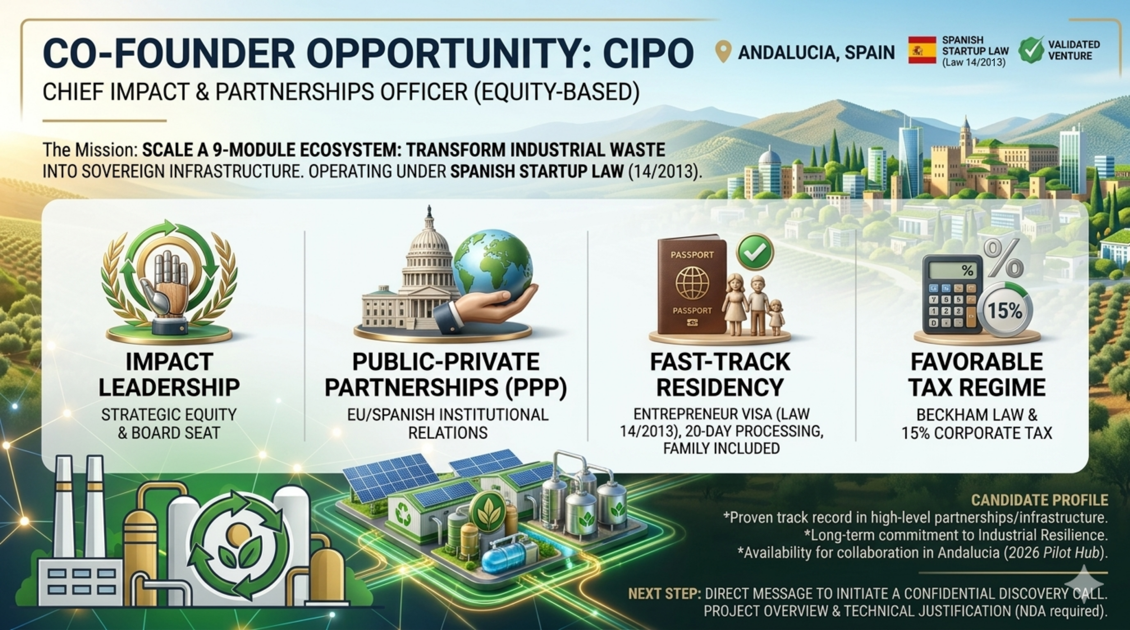 We are onboarding a final tier of strategic partners for our Spanish government-validated (UGE-CE) industrial pilot. This is a unique entry point offering 4x strategic leverage on a €1.5M pre-incorporation valuation, backed by €6M in vetted IP. We provide an accelerated 20-day EU residency fast-track for co-founding partners committed to scaling regenerative industrial infrastructure.
