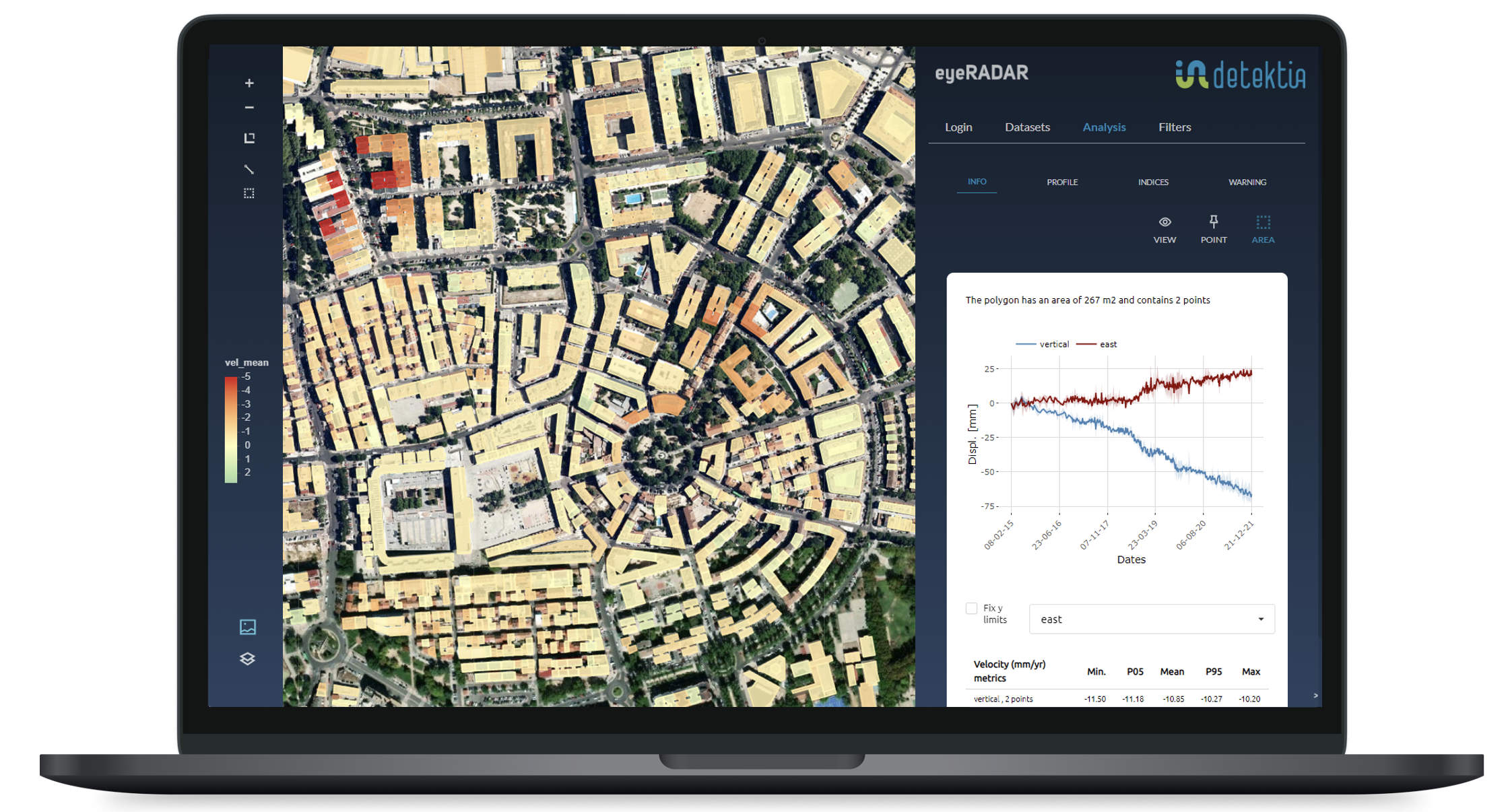 Detektia generates structural health metrics and alerts of building deformation based on satellite radar tech (InSAR) and Machine Learning. These InSAR-derived structural health metrics and alerts are integrated into into the digital twin of the cities or historical centers and will help answer important questions that will have a very positive impact on the management of areas with invaluable historical significance. Questions such as: Which historical buildings, areas, or infrastructures have experienced or are currently experiencing unexpected deformation? Are there stability issues in certain areas or buildings within the city? Which buildings specifically? What is the magnitude of the problem? Which buildings or infrastructures need intervention with the highest priority? When did this anomaly occur? Is the deformation related to a weather event (precipitation), an urban construction project…? What has been the exact impact of an urban construction project (such as tunneling or any underground work) on the surrounding buildings and infrastructure?