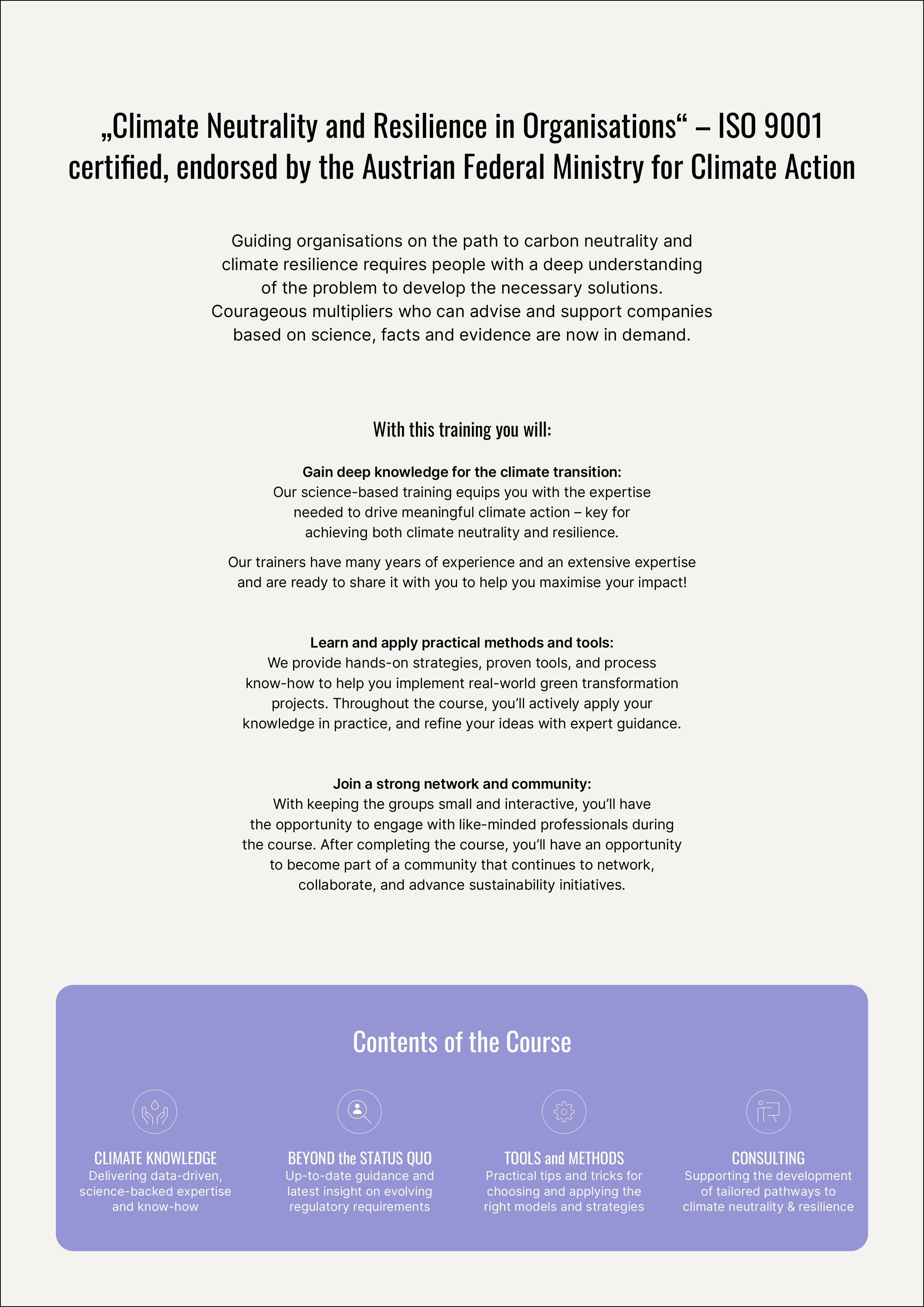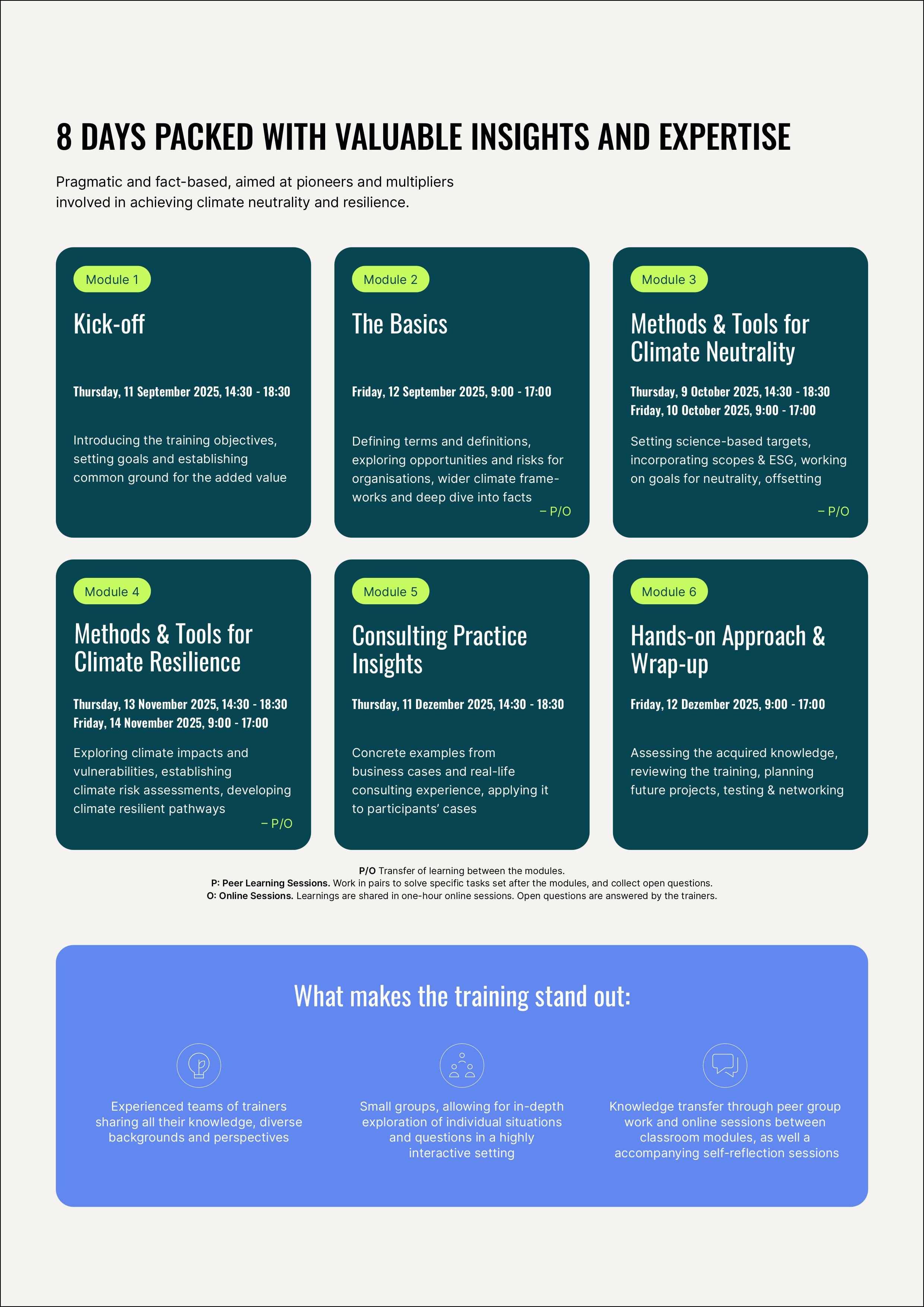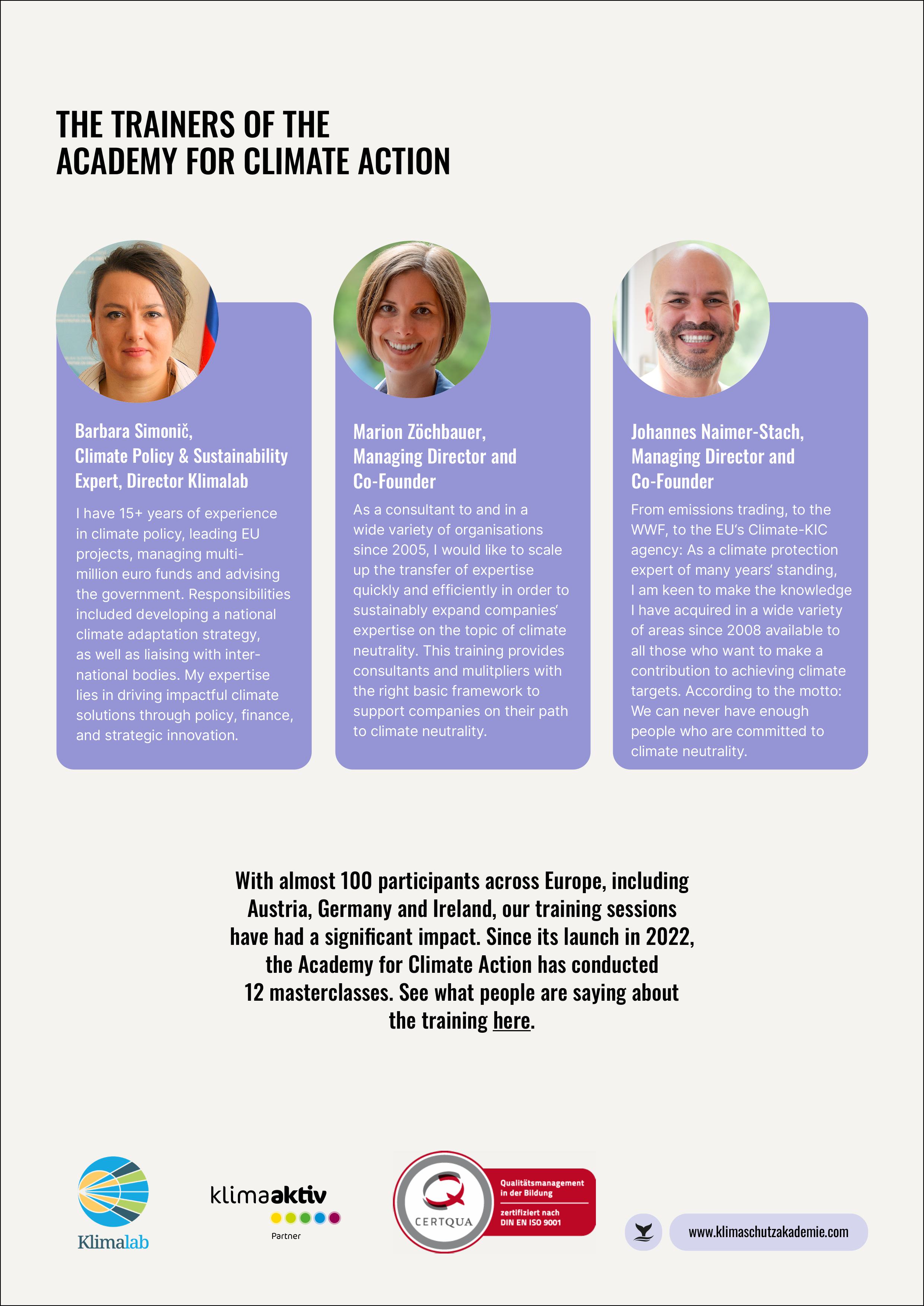With this masterclass you will gain deep knowledge for the climate transition. Our science-based training equips you with the expertise needed to drive meaningful climate action – which is key for achieving both climate neutrality and resilience. Our trainers have many years of experience and an extensive expertise, and are ready to share it with you to help you maximise your impact!