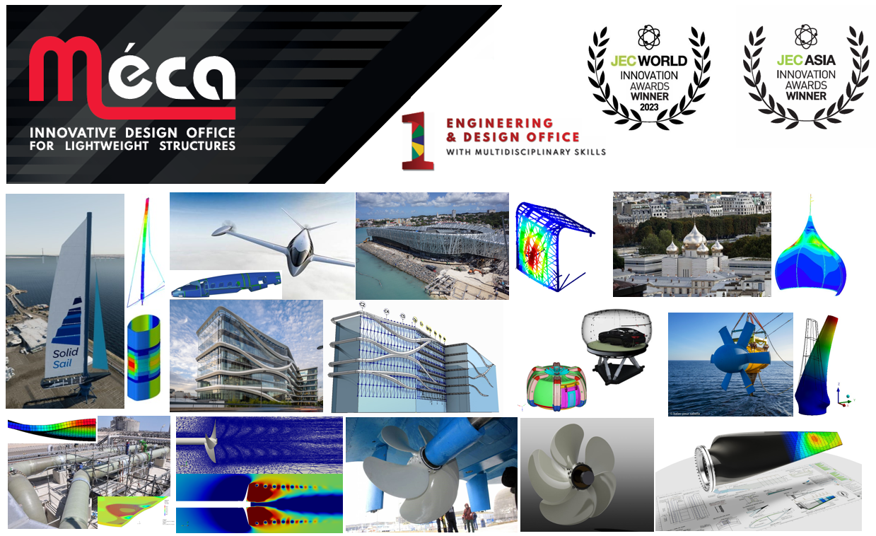 • JEC COMPOSITES INNOVATION AWARD 2023: MECA was honored as a partner of Chantiers de l’Atlantique (Maritime Transportation & Shipbuilding category). We carried out the entire design and calculation of the mast and its assemblies.