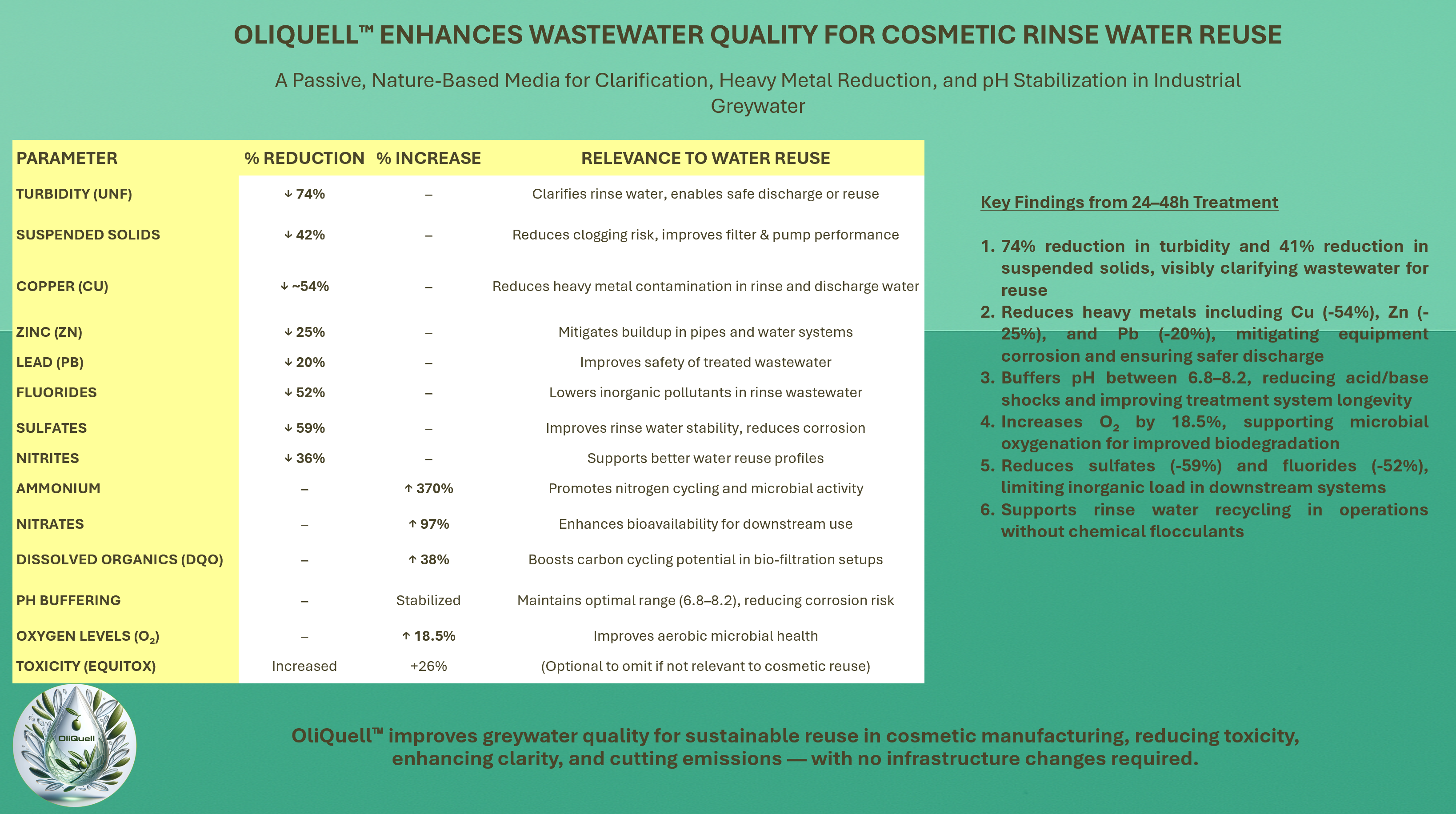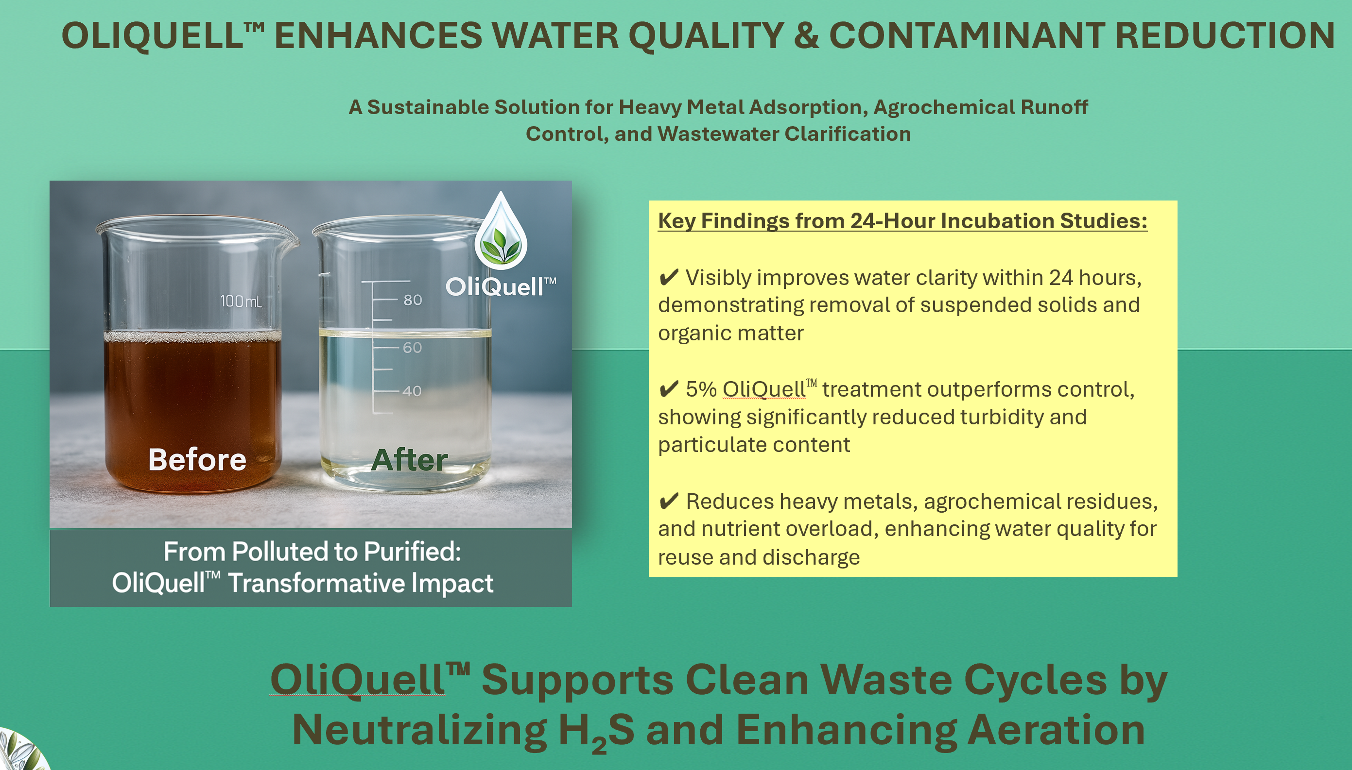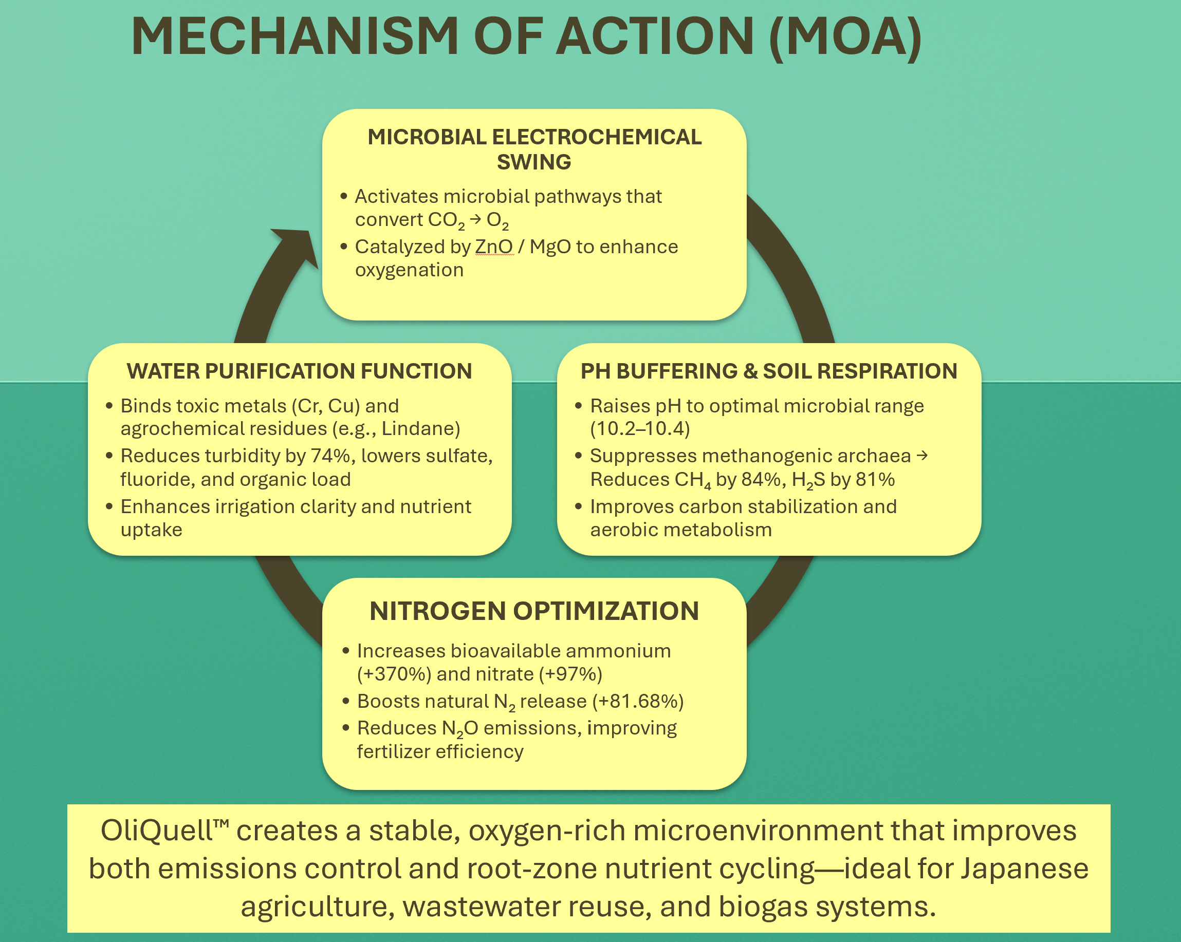 Tested in both agricultural and industrial settings, OliQuell™ delivers a low-cost, scalable, and chemical-free solution aligned with Japan’s decarbonization and sustainability goals.