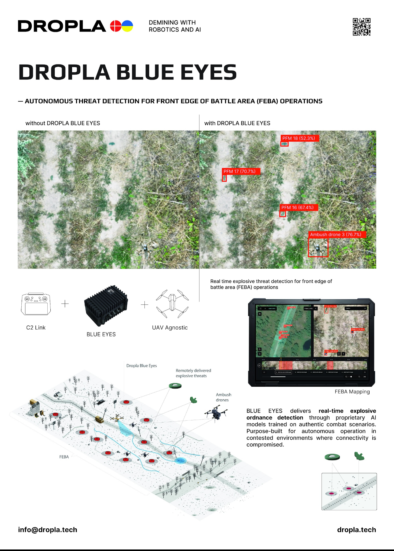 Dropla Blue Eyes: Offline AI vision module for real-time threat detection: landmines, ambush drones. Demo-ready in Denmark, Ukraine