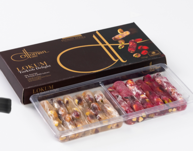 Elysian Series Stick Turkish Delights are sold either in bulk or in boxes. Boxes include 150g. products and have 4 types such as Turkish Delight with Mastic Flavor & Kadaifi Covered Pomegranate Flavor and Pistachio, Turkish Delight with Pomegranate Flavor and Pistachio, Turkish Delight with Mulberry & Blackberry Flavor and Pistachio, Turkish Delight with Mango & Pineapple Flavor and Pistachio.