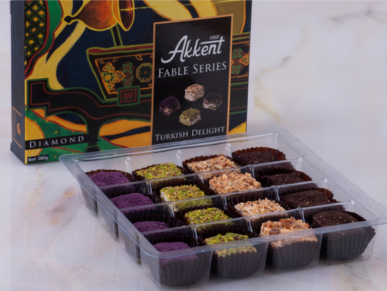 Fable Series Turkish Delights has 3 types which includes Diamond (mixed varieties of diamond series layered Turkish delight), Gourmet (mixed varieties of gourmet Turkish delight) and Savoure (mixed varieties of Sultan rolled Turkish delight),individually.