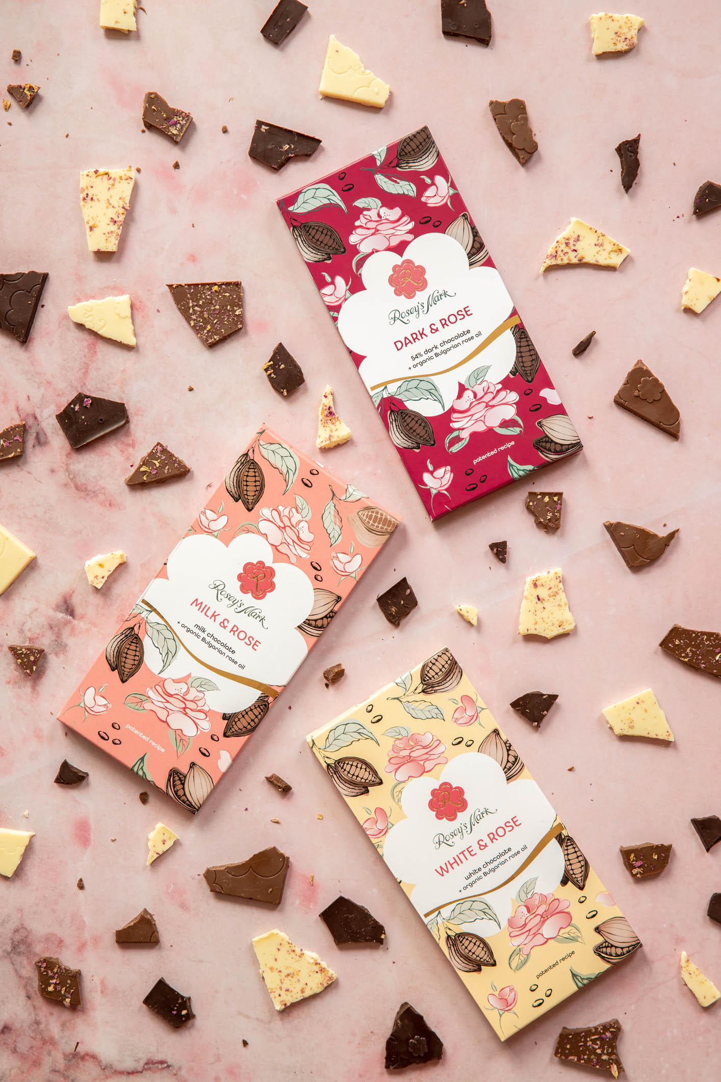 Rosey's Mark chocolates are with original recipe registered at the Bulgarian Patent office. We use premium Belgium chocolate with traceable sustainable cocoa and organic Bulgarian rose oil (PGI of EU).