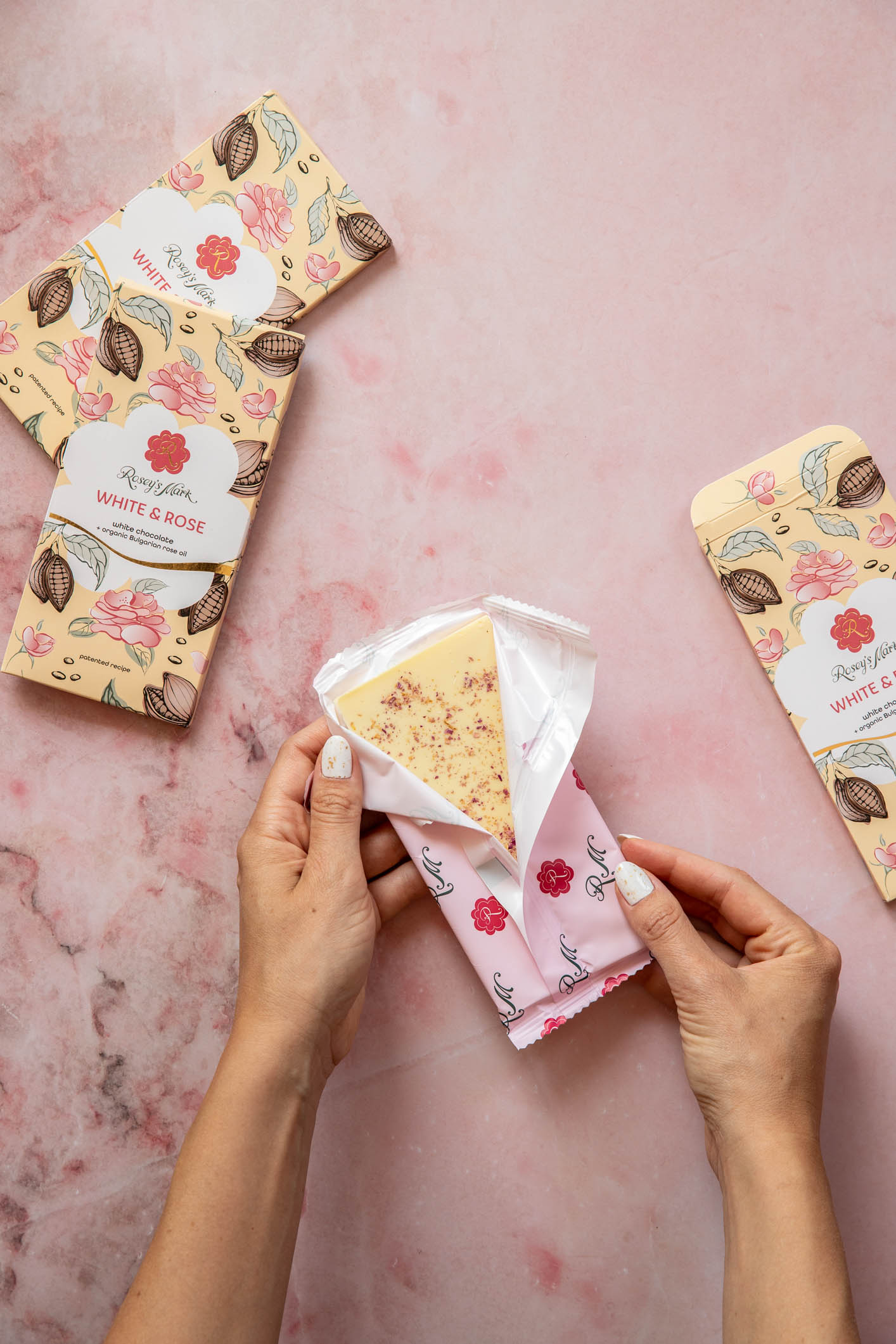 The taste is delicate, balanced, joyful. The thin shape ensures the magic crack sound and feel, further melting in your month. The look is captivating in every detail from the beautiful packaging to the tiny rose petals of the chocolate and blossom share on the molds. The scientifically proven anti-stress effect of rose oil turns the chocolates into anti-stress power product.