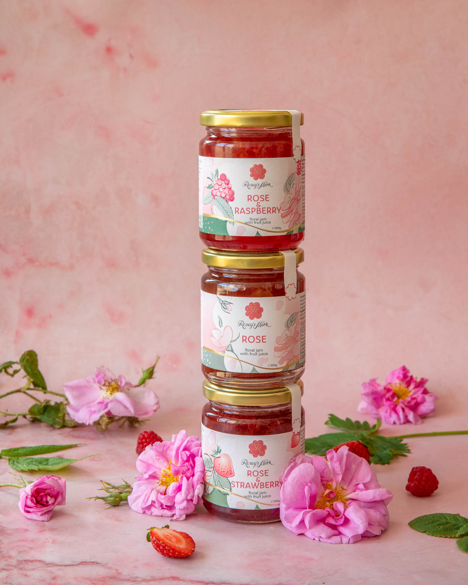 Rosey's Mark jams collection is made of organic Bulgarian rose petals and fruit juice concentrate instead of sugar. Fresh floral delicate taste less calories, less sweet. No artificial coloring and preservatives added. Tradition and innovation combined in a jar of roses carefully selected by hand.