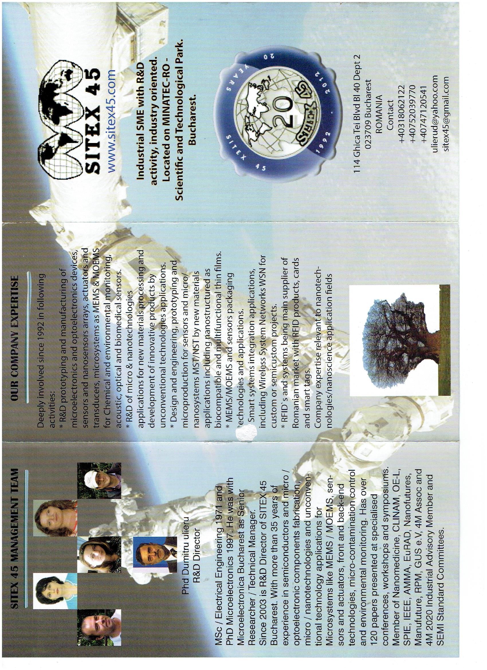 SITEX 45 SRL Company, BUCHAREST, Romania SITEX 45 SRL is a Romanian SME with R&D activity, industry oriented, located on MINATEC-RO / Scientific and Technological Park for Micro and Nanotechnology Bucharest deeply involved since 1992i n a wider range of activities like: (i) R&D prototyping and manufacturing of microelectronics and optoelectronics devices, photonic devices, sensors and sensors arrays, actuators and transducers, microsystems as MEMS & MOEMS for Chemical and environmental monitoring, acoustic, optical and biomedical sensors; involved since 1992 on a wider range of activities like: (i) R&D prototyping and manufacturing of microelectronics and optoelectronics devices, photonic devices, sensors and sensors arrays, actuators and transducers, microsystems as MEMS & MOEMS for Chemical and environmental monitoring, accoustic, optical and biomedical sensors; (ii) R&D of micro & nanotechnologies applications for; new materials processing and development of innovative products by unconventional technologies applications; (iii) Design and engineering, prototyping and micro-production for sensors and microsystems by new materials applications including nanostructured, biocompatible and multifunctional thin films; (iv) Smart systems integration applications for analytical analysis and monitoring of environment ,medical and biomedical ,metrological instrumentation. (v) Wireless System Networks WSN for health and structural health, conditions monitoring; (vi) RFIDs and Internet of Things (IoT) systems, RFID products, smart cards and tags. Partner a/o coordination for R&D projects (i)National programs :MATNANTECH (New materials, micro and nanotechnologies), CEEX (Research of Excellence ) , National R&D Programs PNII/Innovation and Partnerships (2007-2013) and PNII(2014-2020) and PNIII(2021-2027) (ii) European programs/projects : FP5, FP6, FP7,,H2020, Marie Curie, MNT-ERA NET, M-ERA-NET, MANUNET, Σureka / Eurostar. Manunet, Euronanomed, Marie Curie and more recently, FP7 successfully closed (MEMSCON, COMPOLIGHT and most recently MOSYCOUSIS, FP7, project INSTANT/FP7 and SENSGLASS / MNT-ERA-NET with other three projects under MANUNET Program also as OLIDIGRAPH/ MANUNET 2018.like CUSTOM- ICRS/MANUNET/2015, NOVAGLASS/MANUNET 2015 and ROBOGRIP/2015. Actually SITEX 45 was also involved as partner of three successfully closed projects under H2020 Program Marie Curie like TROPSENSE/RISE-, H2020/2014,NANOGENTOOLS/ RISE-H2020/2015 and bTB Test-H2020/2017 otherwise PULSECOM H2020 2019 a SITEX 45 Team was also previously involved into other programs like M-ERA.NET project MAGPHOGLAS /Transnational Call 2015 and EURIPIDE/ ΣUREKA 2015 „SI & SIGE based generic technological platform for robust, reliable & cost effective novel functional nanoelectronic modules” – POWERTEC . SITEX. is affiliated at RMP; Photonics 21, 4M Multi Material Micro Manufacture , Photonics, 21 BioNanoNet BNN as well as active member of more specialized European platforms like Nanomedicine, EPoSS (European Platform for Smart Systems Integration ) , Nanofutures, Manufuture (www.manufuture.org ) ,CLINAM , Photonics 21 and RTP as well as Associations as EUMA ,EuRAD,4M(Multi Materials Micro Manufacture) NoE and 4M2020! Association , AMA/German Ass for Sensors Technologies and IVAM- Microtechnology Network,, GUS e.V (German Ass for Environment Simulation),SPIE ,ETPN ,The European Photonics Industry Consortium (EPIC) and ICCCS (International Confederation of Contamination Control Societies ) and SEMI Standards Committees Voting member since 2000 and joined to BioNanoNet (BNN) and OE-A (Organic Electronics Ass.). It was for 6 years IAB (Industrial Advisory Board ) member for 4M NoE 2004/2009 coordinated by Cardiff University and since 2010 of 4M2020 & 4M Association coordinated by Birmingham University (UK) ,