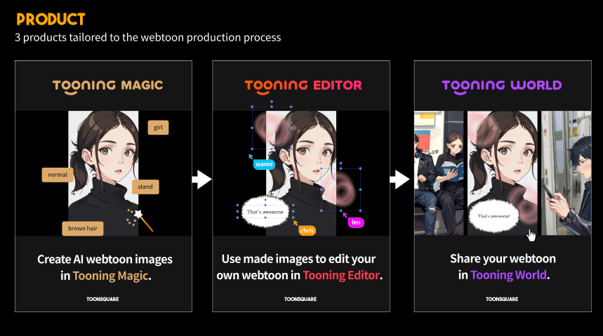 Tooning services combine the sentiment and morphology analysis capabilities of Toonsquare’s natural language processing (NLP) technology – which can automatically create individual webtoon images based on simple sentences – with the generative-AI model Stable Diffusion and Chat GPT technology to shorten production time and increase webtoon quality, adding efficiency and innovation to digital content creation.