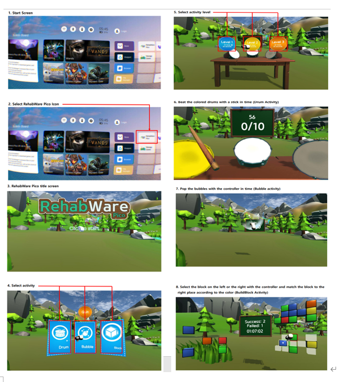 In the digital healthcare field, VR technology can be an innovative alternative. It consists of 8 training and experience contents and 1 content for statistical analysis.