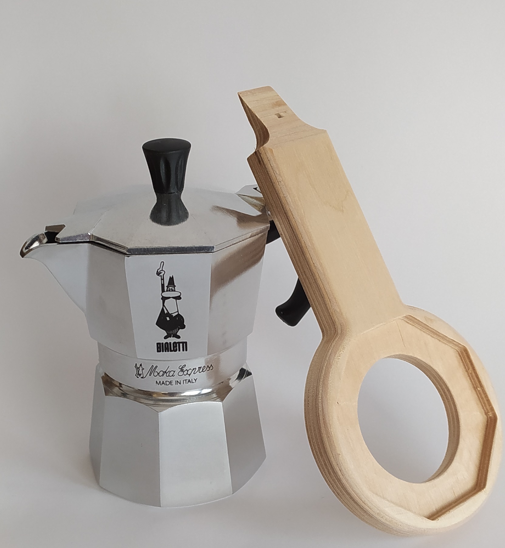 Aprimoka si distingue per essere realizzato in legno massello naturale non trattato, ponendosi come elemento di congiunzione tra l'alluminio lucente della caffettiera e il profumo naturale del caffè in polvere, rafforzando così l'autenticità e la sostenibilità della filiera italiana.