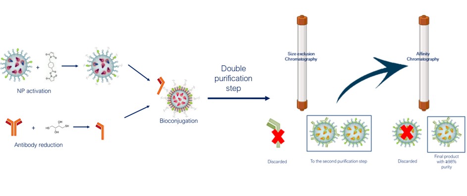 The shield effect exerted by nanoparticle, allows the application of a revolutionary purification protocol of bioconjugated assuring a higher purity degree of the final conjugated with consequent reduced background signals. In brief, the protection offered to the sensitive dyes included in the nanoparticles, allows the adoption of an affinity chromatography purification step which requires a low pH elution otherwise impossible to apply due to the intrinsic sensitivity of conventional used probes. The coupling of the historically used purification method by size exclusion chromatography to the second affinity step, increases the purity degree of the final conjugated over 90% .