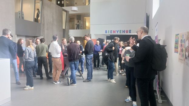 Session de partage entre participants, experts et chercheurs autour d'un buffet.