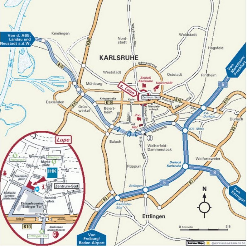 Immediately afterwards, turn right again into Erbprinzenstraße, after approx. 70 m turn left into the underground car park ‘IHK - Haus der Wirtschaft’ (see magnifying glass under directions).