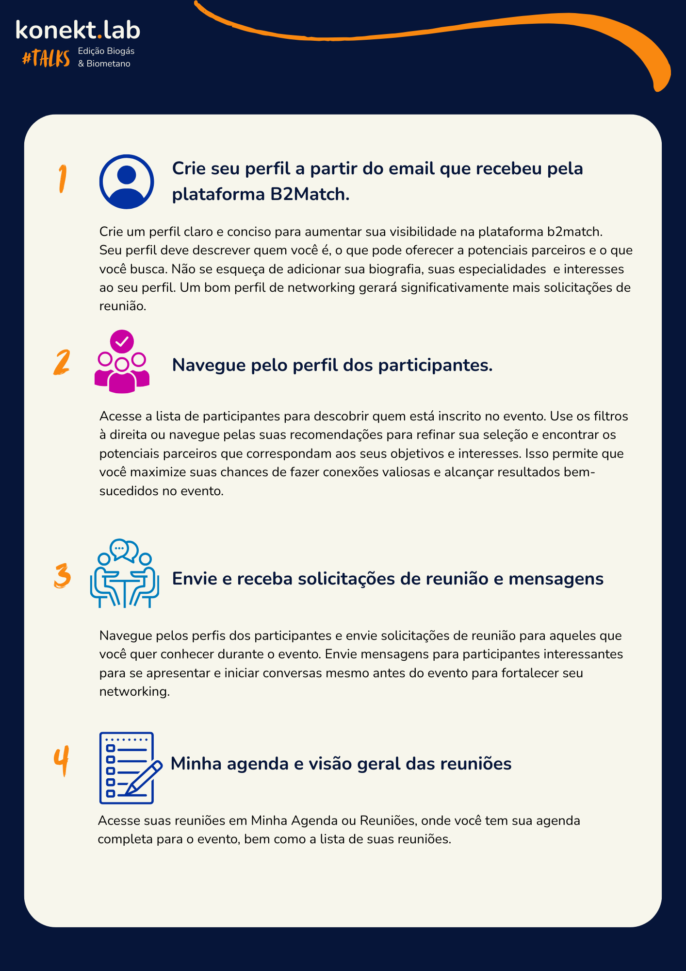 Você terá 4 oportunidades de 15 minutos para potencializar suas conexões. Cada encontro se torna uma oportunidade valiosa para construir conexões reais: um espaço direcionado para conhecer parceiros em potencial, avaliar rapidamente interesses e áreas de expertise, além de identificar objetivos comuns e sinergias que podem evoluir para futuras parcerias.