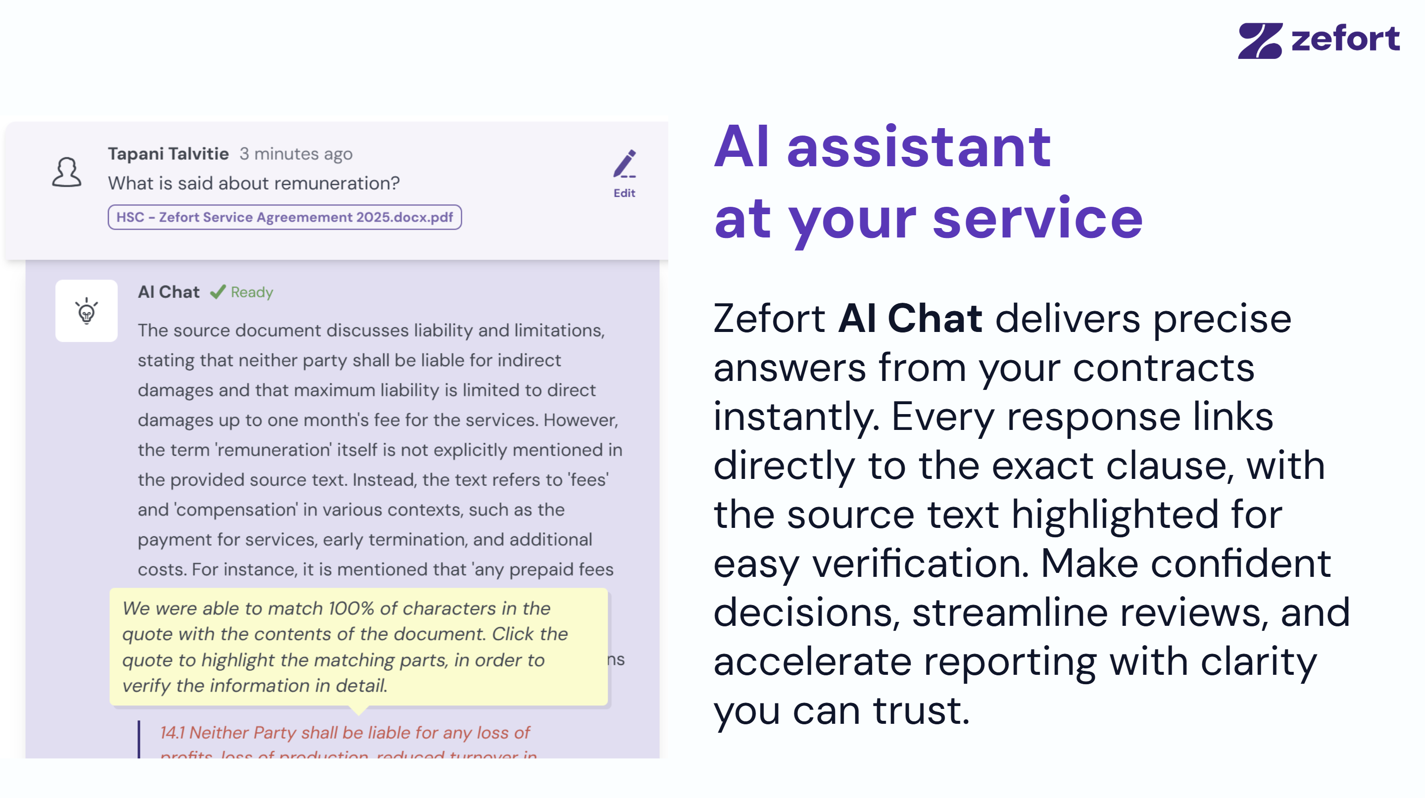 Zefort's AI Chat lets you ask natural-language questions across your entire contract portfolio: "Which supplier agreements allow data storage outside the EU?" — answered in seconds, not days.