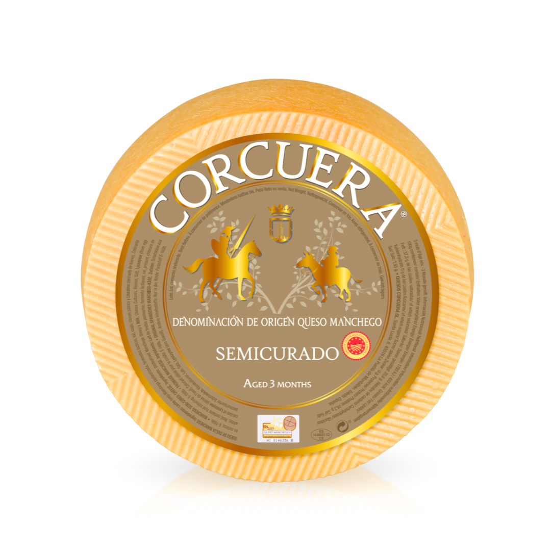 Pasteurized Semicured Manchego PDO 3 months. Whole piece 3kg and 1kg. Wedges.