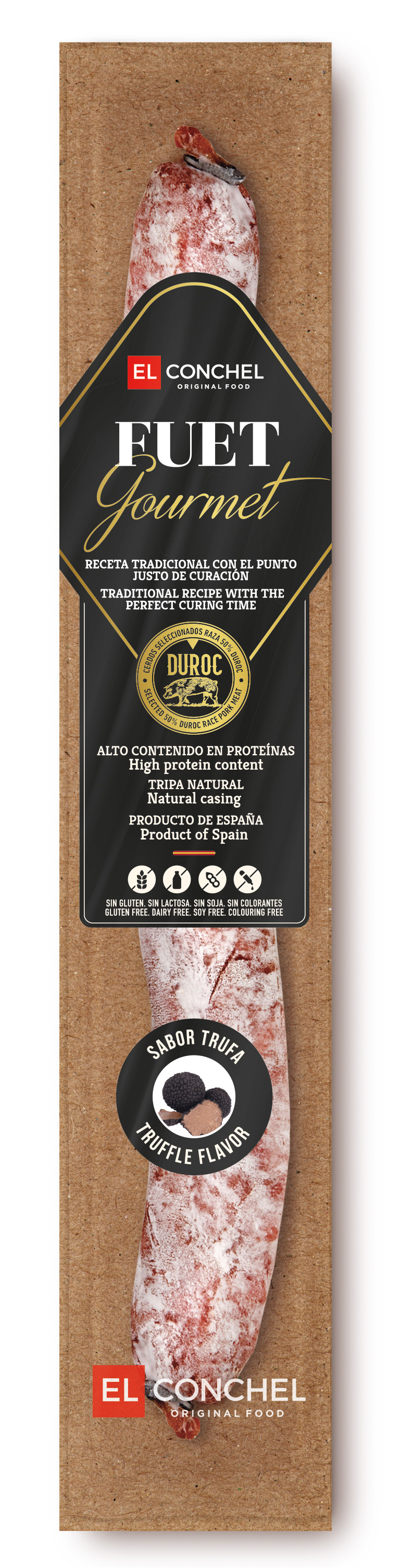Our fuets are done with the best selected Spanish and fresh raw materials. We use cross duroc pork meat, the best spices from national suppliers and natural casing, to achieve a result that exceeds the regular standards of commercial fuets. We cunt in our range with ten different flavors. Traditional fuet, fuet with Italian black truffle, and 8 flavors of fuets covered in herbs and spices, being those: garlic, sun-dried tomatoes, chimichurri, Ras El-Hanout, black pepper, red pepper, rosemary, fine herbs.