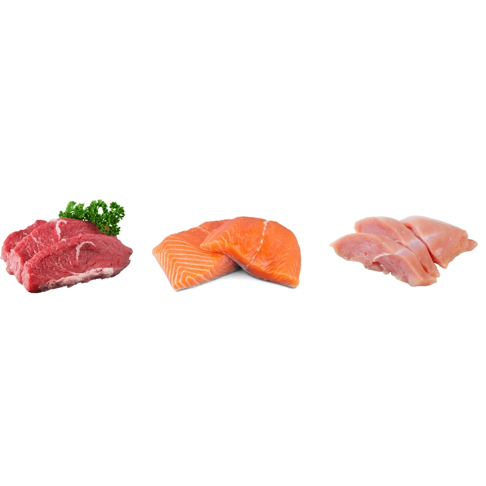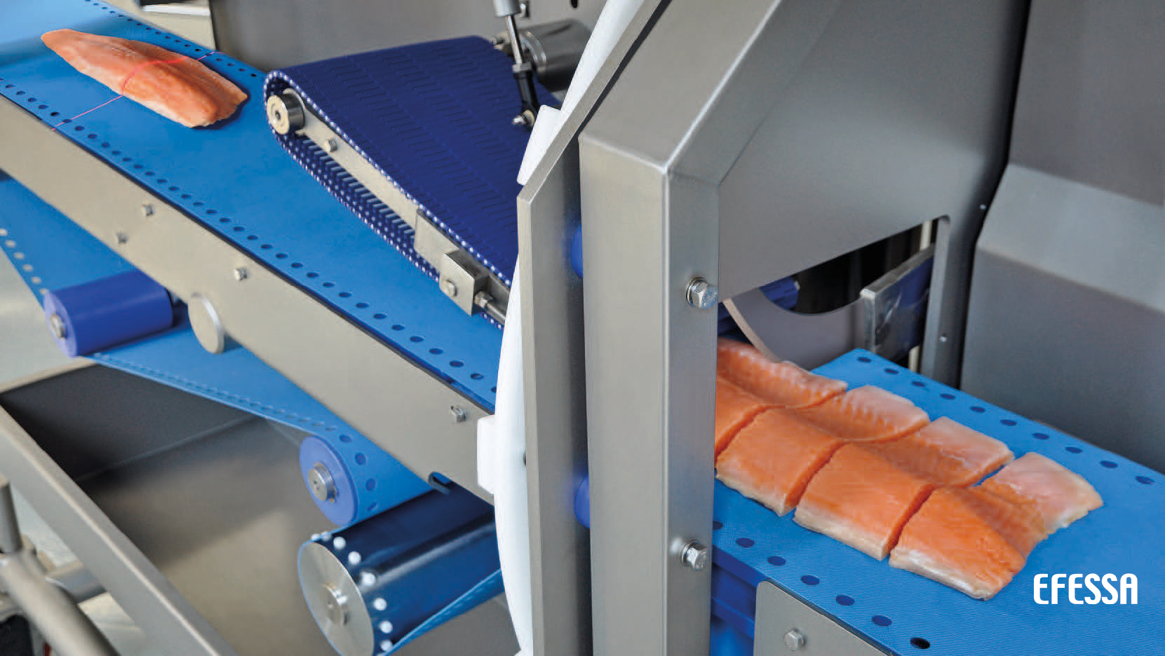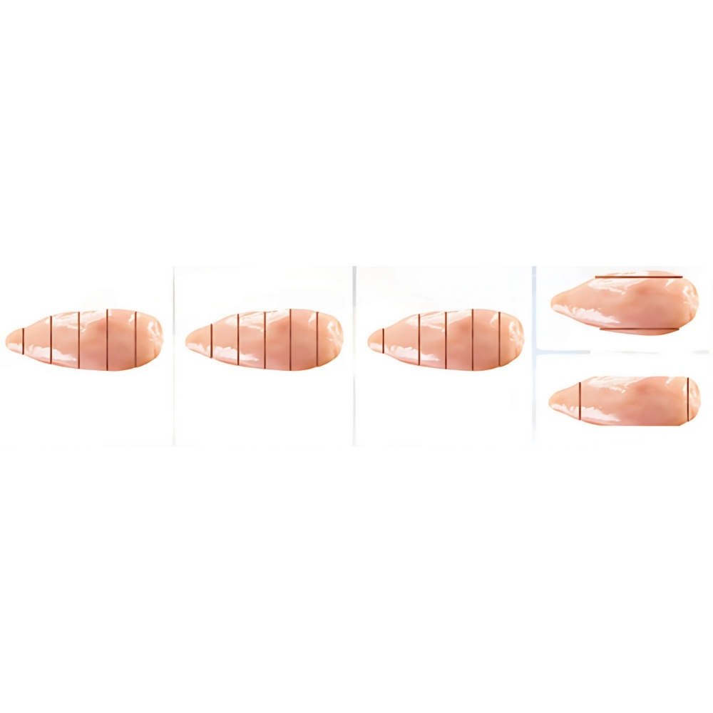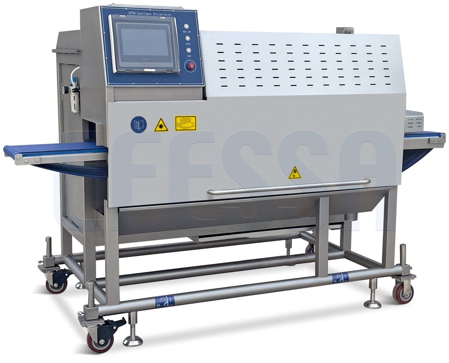 The two-dimensional (three-dimensional) measurement of irregular meat is used, analytical calculation by software, which can get the product cutting length and do multiple degrees (90°, 60°, or 45°) cutting. Then it can make sure each piece with same weight after cutting or other required weight. It can be applied with fresh raw meat (thaw) cutting.